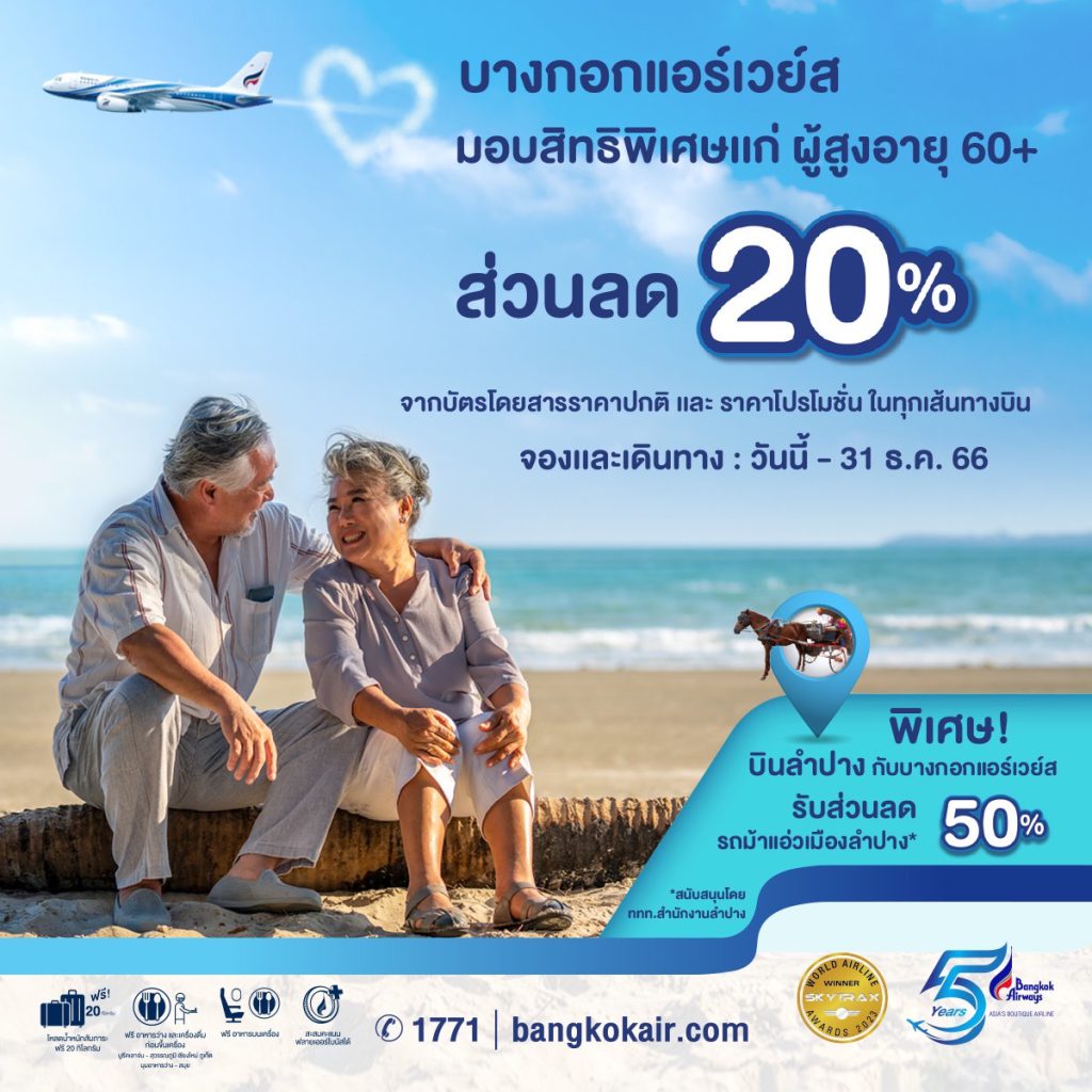 ททท.สำนักงานลำปาง ชวนคนไทยวัยเก๋า รับส่วนลด 20% ในทุกระดับชั้นจากราคาปกติของบัตรโดยสารบางกอกแอร์เวย์ส โดยสำรองที่นั่งและเดินทาง : วันนี้ – 31 ธันวาคม 2566 ผ่านเว็บไซต์ คลิก! https://bit.ly/3rLhves
