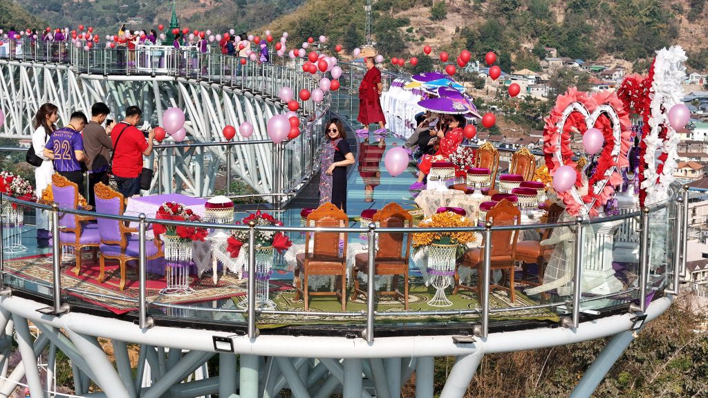 เนื่องจากวันนี้เป็นวันแห่งความรัก หรือ “วันวาเลนไทน์ ประจำปี 2567” ทำให้เมื่อช่วงเช้าที่ผ่านมาบรรยากาศบน “วัดพระธาตุดอยเวา” มีความคึกคักและอบอวลไปด้วยความรักมากเป็นพิเศษ เพราะว่าสำนักทะเบียนอำเภอแม่สาย ร่วมกับองค์กรปกครองท้องถิ่นและวัดพระธาตุดอยเวา ได้จัดกิจกรรม “การจดทะเบียนสมรสบนสกายวอล์ค เหนือสุดแดนสยาม” สถานที่ท่องเที่ยวและจุดเช็คอินที่มาแรงของอำเภอแม่สาย โดยมีตัวแทนคู่รักจำนวน 15 คู่ ซึ่งมีทั้งคนไทย คนเมือง และกลุ่มชาติพันธ์ ไม่ว่าจะเป็นอาข่า ลาหู่ ไทใหญ่ มีความโชคดีได้รับการคัดเลือกจากหน่วยงานที่เกี่ยวข้องให้เข้าร่วมกิจกรรมนี้