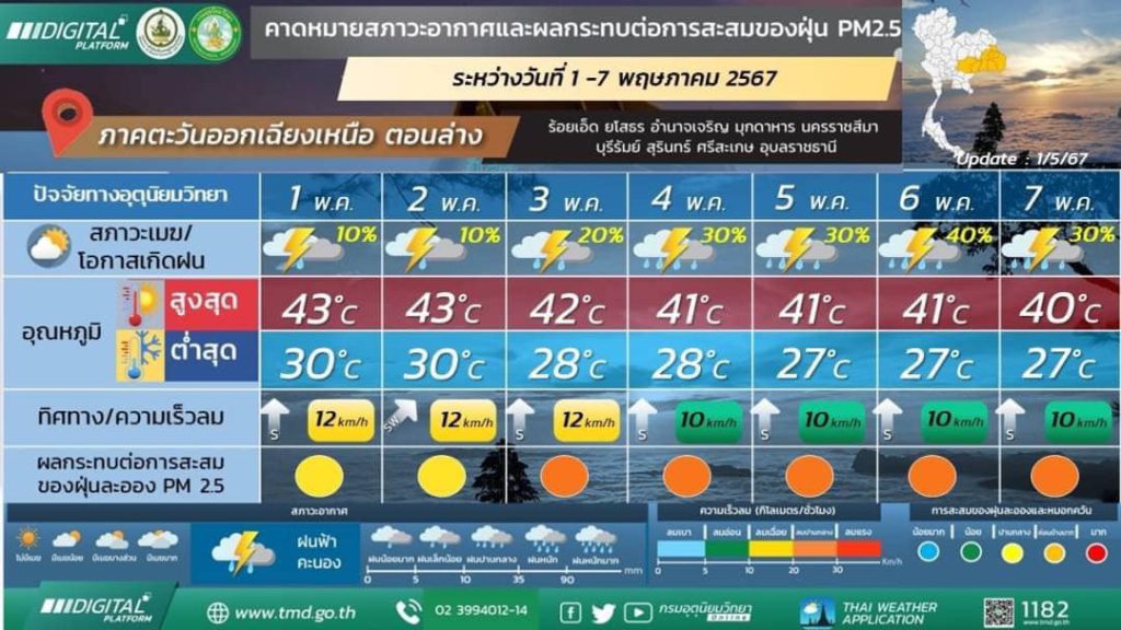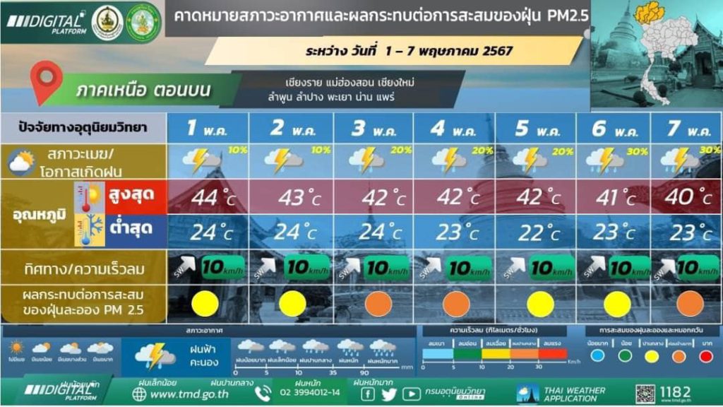 พยากรณ์อากาศ 7 วันข้างหน้า: ในช่วงวันที่ 1 – 5 พ.ค. 67 ความกดอากาศต่ำเนื่องจากความร้อนปกคลุมประเทศไทยตอนบน ลักษณะเช่นนี้ทำให้ประเทศไทยมีอากาศร้อนถึงร้อนจัดโดยทั่วไป กับมีฟ้าหลัวในตอนกลางวัน ในขณะที่ลมตะวันตกเฉียงใต้และลมใต้พัดปกคลุมประเทศไทยตอนบน ทำให้บริเวณดังกล่าวมีฝนฟ้าคะนองกับมีลมกระโชกแรงเกิดขึ้นได้บางพื้นที่ ในขณะที่ในช่วงวันที่ 3 – 5 พ.ค. 67 คลื่นกระแสลมฝ่ายตะวันตกพัดปกคลุมภาคเหนือตอนบนและภาคตะวันออกเฉียงเหนือตอนบน ประกอบในช่วงวันที่ 5-7 พ.ค. 67 มีแนวพัดสอบของลมตะวันตกเฉียงใต้และลมใต้พัดปกคลุมบริเวณภาคตะวันออกเฉียงเหนือ ภาคตะวันออก และด้านตะวันตกของภาคเหนือและภาคกลาง ในขณะที่ประเทศไทยตอนบนมีอากาศร้อนถึงร้อนจัด ทำให้ในช่วงวันที่ 3-7 พ.ค. 67 บริเวณดังกล่าวมีพายุฤดูร้อนเกิดขึ้นบางพื้นที่ โดยมีลักษณะของพายุฝนฟ้าคะนอง ลมกระโชกแรง และลูกเห็บตกบางแห่ง รวมถึงอาจมีฟ้าผ่าเกิดขึ้นได้บางพื้นที่