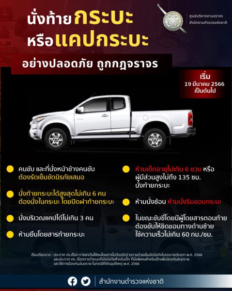 ส่วนการนั่งบริเวณแคปหรือนั่งท้ายกระบะ สามารถนั่งได้โดยไม่ต้องรัดเข็มขัดนิรภัย แต่ต้องนั่งไม่เกินจำนวนที่กำหนด ในลักษณะที่ปลอดภัย และผู้ขับขี่ต้องขับขี่ด้วยความเร็วตามที่สำนักงานตำรวจแห่งชาติประกาศกำหนด ซึ่งเรื่องนี้ ยังอยู่ระหว่างการพิจารณาของสำนักงานตำรวจแห่งชาติและหน่วยงานที่เกี่ยวข้อง คาดว่าจะแล้วเสร็จภายในวันนี้ 4 ธันวาคมนี้