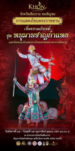 จังหวัดเชียงราย ร่วมกับมหาวิทยาลัยราชภัฏเชียงราย กำหนดจัดกิจกรรม 50 ปี มหาวิทยาลัยราชภัฏเชียงราย “5 ทศวรรษ ราชภัฏเชียงราย” เพื่อรำลึกถึงพระมหากรุณาธิคุณของพ่อขุนเม็งรายมหาราช ที่ทรงสร้างเมืองเชียงราย ครบรอบ 761 ปี และในโอกาสการสถาปนามหาวิทยาลัยราชภัฏเชียงรายครบรอบ 50 ปีในฐานะสถาบันอุดมศึกษาแห่งแรกของจังหวัดเชียงรายจึงได้ขอพระราชทานการแสดงโขนจากโรงมหรสพหลวงศาลาเฉลิมกรุง โดยเห็นว่าเป็นการแสดงศิลปวัฒนธรรมไทยที่มีความสวยงามมีเอกลักษณ์โดดเด่นและเป็นศิลปะการแสดงชั้นสูงประจำชาติตลอดจนเป็นการธำรงค์รักษาและสืบสานไว้ซึ่งศิลปวัฒนธรรมประจำชาติ และเผยแพร่ให้กว้างขวางในภูมิภาคอันจะก่อให้เกิดความภูมิใจร่วมกันของคนในชาติรวมทั้งเป็นการโหมโรงการเตรียมการสู่งานนิทรรศการศิลปะนานาชาติ ” Thailand Biennale Chiangrai” ในช่วงปลายปี 2566 นี้ด้วย