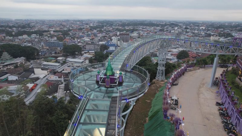 ทางเดินกระจกหรือสกายวอล์คแห่งที่ 3 ของเชียงราย บนยอดเขาวัดพระธาตุดอยเวา ต.เวียงพางคำ อ.แม่สาย จ.เชียงราย วัดดังติดชายแดนไทย-เมียนมา หลังจากโครงการดำเนินมาหลายเดือน ล่าสุดได้มีการยกโครงโลหะที่มีลักษณะเป็นสะพานที่แยกเป็นส่วนๆ ขึ้นไปประกอบติดกันบนเสาเสร็จตลอดแนวแล้ว โดยมีลักษณะเป็นทรงโค้งขนานไปกับถนนทางลงดอยเวา รอนำกระจกไปติดตั้ง