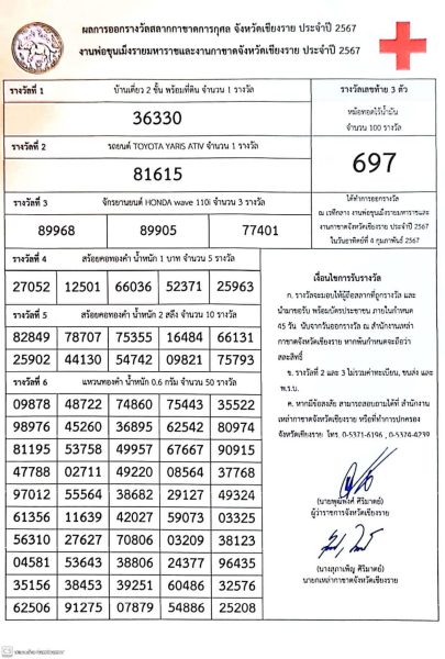 ผลการออกรางวัล สลากกาชาดการกุศลจังหวัดเชียงราย ประจำปี 2567