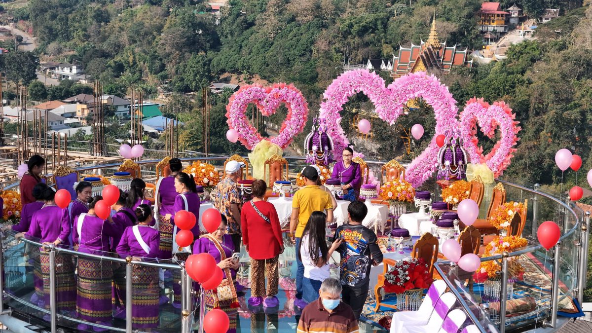 เนื่องจากวันนี้เป็นวันแห่งความรัก หรือ “วันวาเลนไทน์ ประจำปี 2567” ทำให้เมื่อช่วงเช้าที่ผ่านมาบรรยากาศบน “วัดพระธาตุดอยเวา” มีความคึกคักและอบอวลไปด้วยความรักมากเป็นพิเศษ เพราะว่าสำนักทะเบียนอำเภอแม่สาย ร่วมกับองค์กรปกครองท้องถิ่นและวัดพระธาตุดอยเวา ได้จัดกิจกรรม “การจดทะเบียนสมรสบนสกายวอล์ค เหนือสุดแดนสยาม” สถานที่ท่องเที่ยวและจุดเช็คอินที่มาแรงของอำเภอแม่สาย โดยมีตัวแทนคู่รักจำนวน 15 คู่ ซึ่งมีทั้งคนไทย คนเมือง และกลุ่มชาติพันธ์ ไม่ว่าจะเป็นอาข่า ลาหู่ ไทใหญ่ มีความโชคดีได้รับการคัดเลือกจากหน่วยงานที่เกี่ยวข้องให้เข้าร่วมกิจกรรมนี้