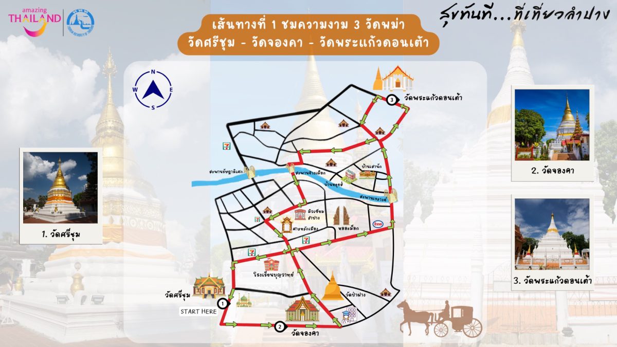 👉 เส้นทางที่ 1 ชมความงาม 3 วัดพม่า เริ่มต้นที่วัดศรีชุม – วัดจองคา – วัดพระแก้วดอนเต้า