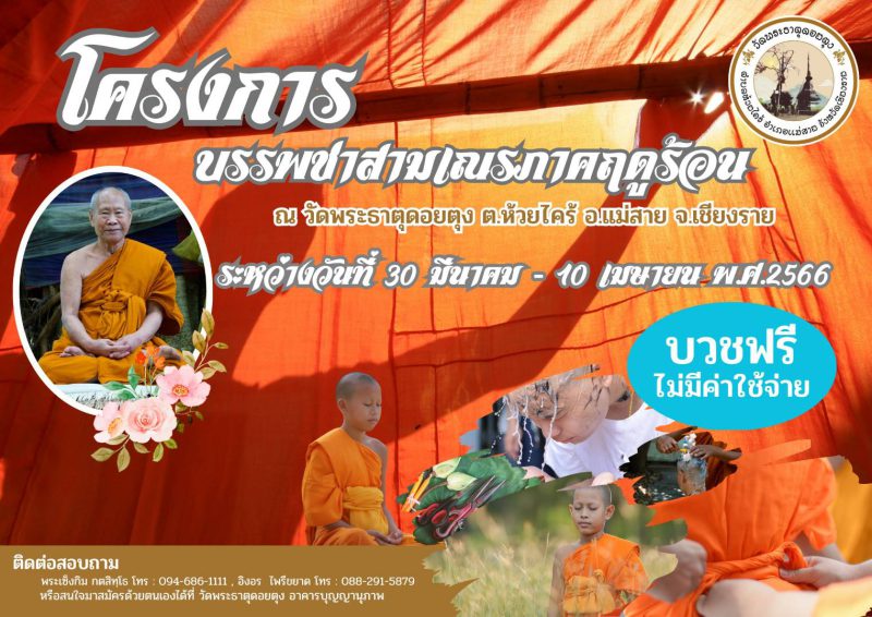 โดยมีนายพุฒิพงศ์ ศิริมาตย์ ผู้ว่าราชการจังหวัดเชียงราย เป็นประธานฝ่ายฆราวาส ซึ่งโครงการบรรพชาสามเณรภาคฤดูร้อนครั้งนี้มีผู้สนใจทั้งนักเรียน นักศึกษา ร่วมบรรพชา จำนวน 74 คน โดยจะได้ศึกษาและปฏิบัติธรรมที่จัดขึ้นเป็นพิเศษในโอกาสนี้ตลอดระยะเวลา 15 วัน
