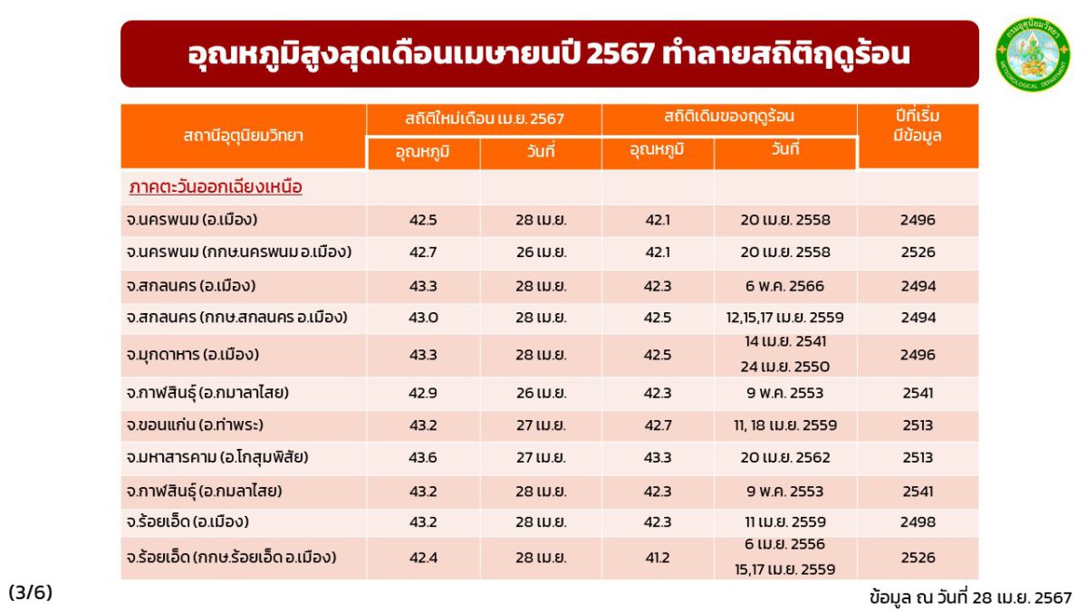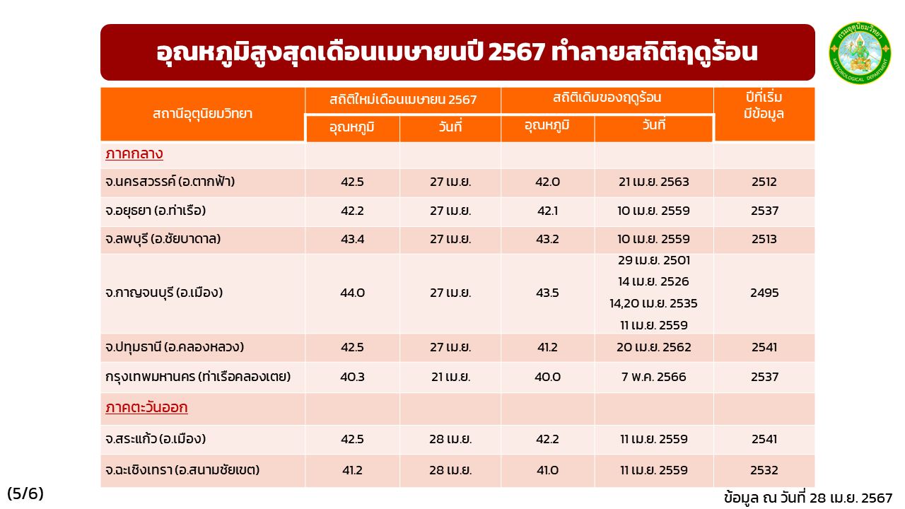 10 อันดับอุณหภูมิสูงสุดประจำฤดูร้อน 2567 | ข้อมูล ณ วันที่ 28 เมษายน 2567