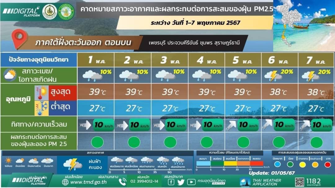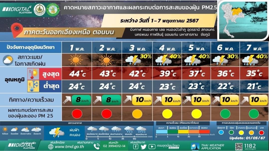 พยากรณ์อากาศ 7 วันข้างหน้า: ในช่วงวันที่ 1 – 5 พ.ค. 67 ความกดอากาศต่ำเนื่องจากความร้อนปกคลุมประเทศไทยตอนบน ลักษณะเช่นนี้ทำให้ประเทศไทยมีอากาศร้อนถึงร้อนจัดโดยทั่วไป กับมีฟ้าหลัวในตอนกลางวัน ในขณะที่ลมตะวันตกเฉียงใต้และลมใต้พัดปกคลุมประเทศไทยตอนบน ทำให้บริเวณดังกล่าวมีฝนฟ้าคะนองกับมีลมกระโชกแรงเกิดขึ้นได้บางพื้นที่ ในขณะที่ในช่วงวันที่ 3 – 5 พ.ค. 67 คลื่นกระแสลมฝ่ายตะวันตกพัดปกคลุมภาคเหนือตอนบนและภาคตะวันออกเฉียงเหนือตอนบน ประกอบในช่วงวันที่ 5-7 พ.ค. 67 มีแนวพัดสอบของลมตะวันตกเฉียงใต้และลมใต้พัดปกคลุมบริเวณภาคตะวันออกเฉียงเหนือ ภาคตะวันออก และด้านตะวันตกของภาคเหนือและภาคกลาง ในขณะที่ประเทศไทยตอนบนมีอากาศร้อนถึงร้อนจัด ทำให้ในช่วงวันที่ 3-7 พ.ค. 67 บริเวณดังกล่าวมีพายุฤดูร้อนเกิดขึ้นบางพื้นที่ โดยมีลักษณะของพายุฝนฟ้าคะนอง ลมกระโชกแรง และลูกเห็บตกบางแห่ง รวมถึงอาจมีฟ้าผ่าเกิดขึ้นได้บางพื้นที่