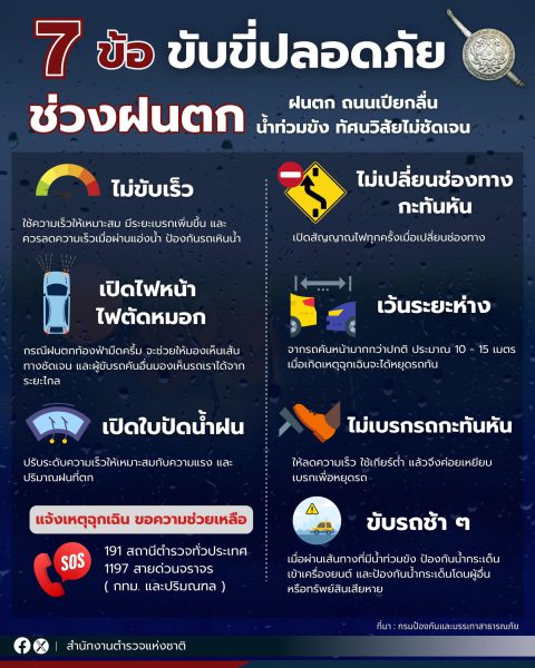 - ทั้งนี้ การขับรถในช่วงฝนตกเสี่ยงต่อการเกิดอุบัติเหตุทางถนนมากกว่าปกติ หากเกิดฝนตกหนักในระดับที่การมองเห็นต่ำกว่า 10 – 15 เมตร ควรจอดพักข้างทางหรือบริเวณที่ปลอดภัย เพื่อความปลอดภัยในการเดินทางในช่วงหน้าฝน