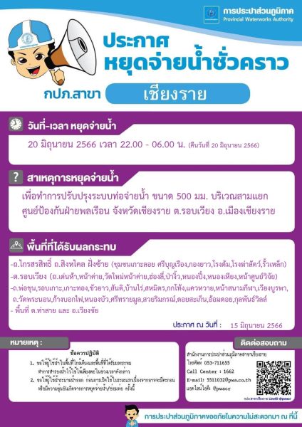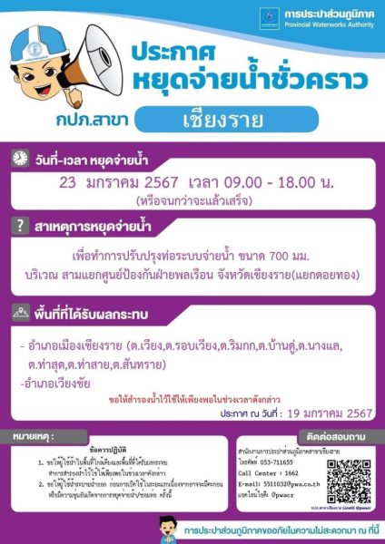 ประกาศหยุดจ่ายน้ำชั่วคราว จากประปาเชียงราย วันที่ 23 มกราคม 2567
