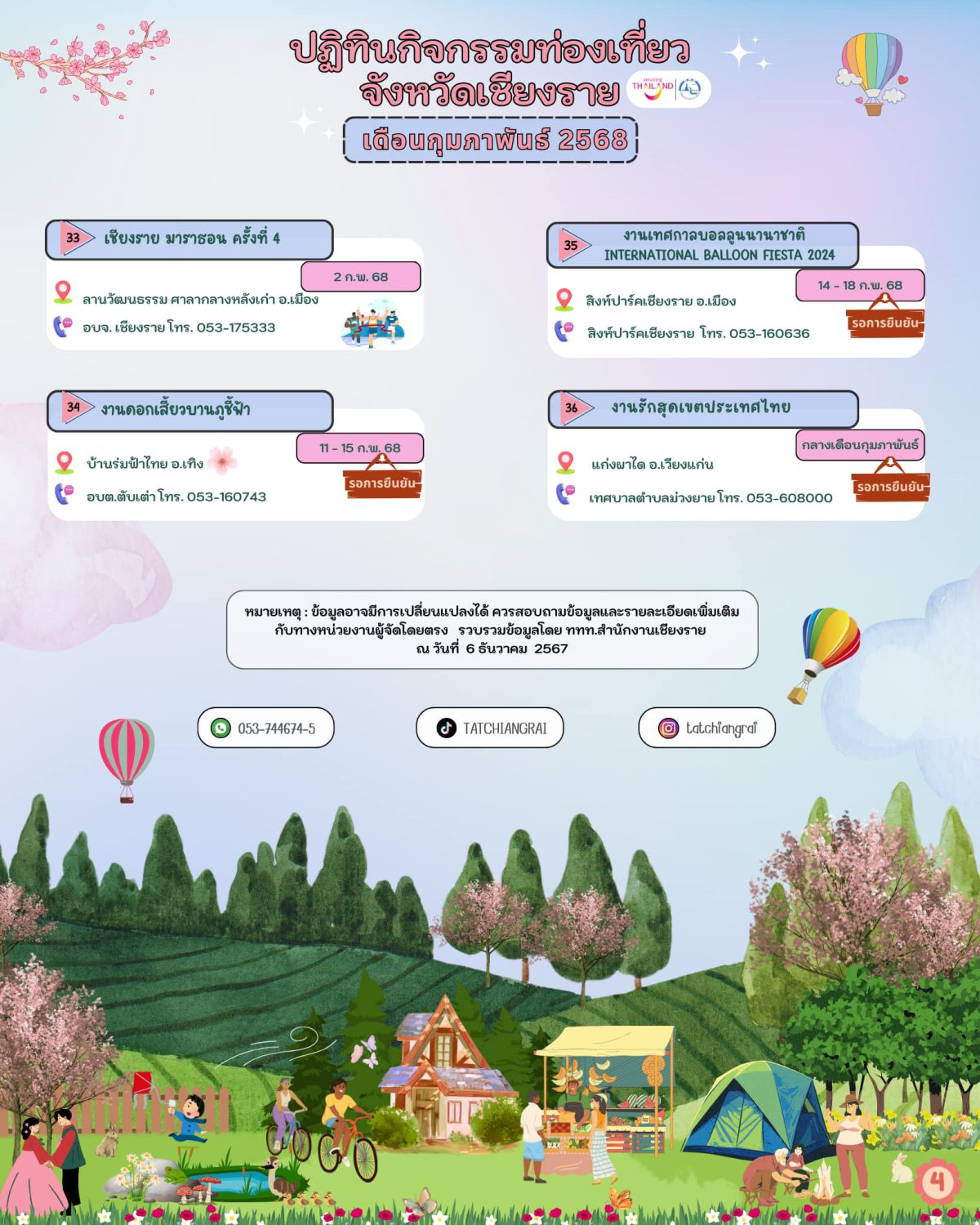 หมายเหตุ : ข้อมูลอาจมีการเปลี่ยนแปลงได้ ควรสอบถามข้อมูลและรายละเอียดเพิ่มเติมกับทางหน่วยงานผู้จัดโดยตรง รวบรวมข้อมูลโดย ททท.สำนักงานเชียงราย ณ วันที่ 6 ธันวาคม 67