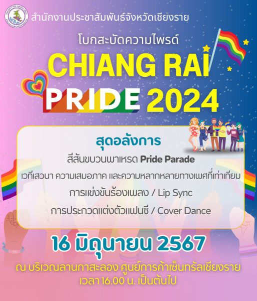 จังหวัดเชียงรายเตรียมจัดกิจกรรม Chiang Rai Pride Month 2025 อย่างยิ่งใหญ่ ในวันอาทิตย์ที่ 22 มิถุนายน 2568 นี้ ที่ ลานกิจกรรมหน้าศาลากลางจังหวัดเชียงรายหลังเก่า และลานกาสะลอง ศูนย์การค้าเซ็นทรัล เชียงราย