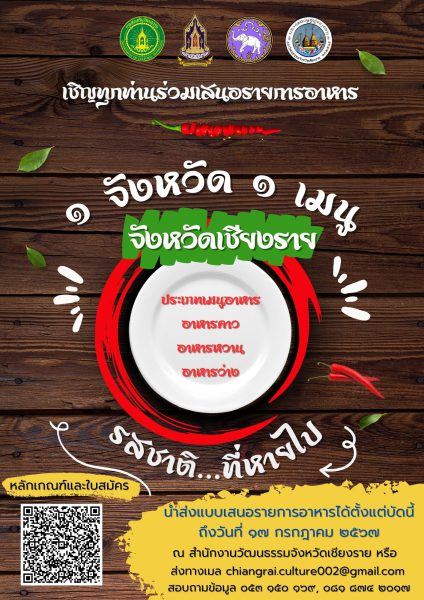ชวนผู้ประกอบการร้านอาหารหรือผู้ที่สนใจ ส่งเมนูอาหารและขนมพื้นถิ่นของจังหวัดเชียงราย เพื่อเข้าร่วมการคัดเลือก “เมนูอาหารถิ่นของจังหวัดเชียงราย (1 จังหวัด 1 เมนู เชิดชูอาหารถิ่น)