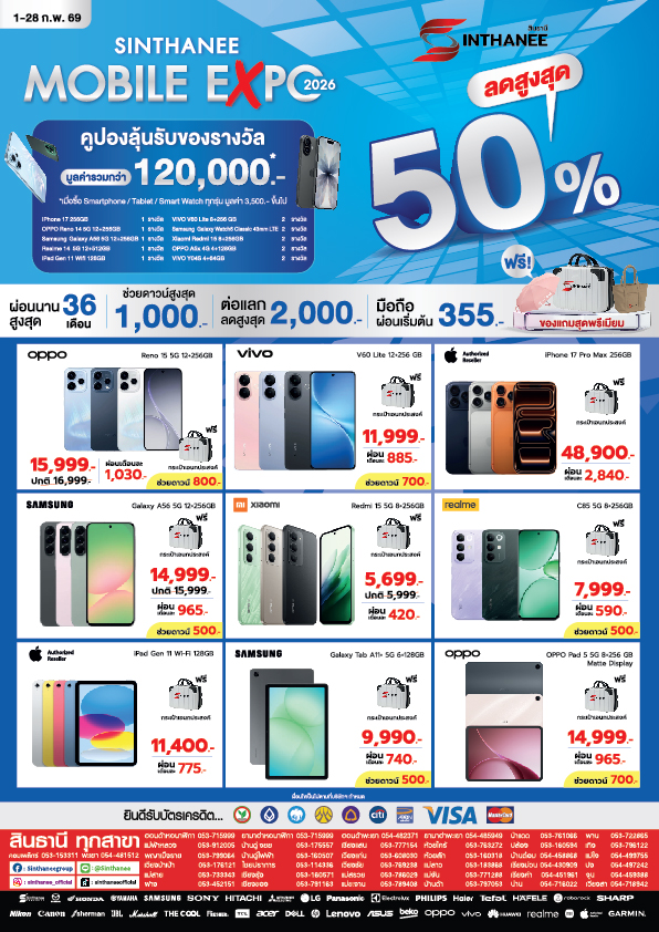 #สินธานี #สินธานีออนไลน์ #เครื่องใช้ไฟฟ้าเชียงราย #เครื่องใช้ไฟฟ้าราคาถูก #เชียงราย #พะเยา #เครื่องใช้ไฟฟ้าราคาถูก #มือถือ #Smartphone #Tablet #SmartWatch #MobileExpo #มือถือราคาพิเศษ #SinthaneeMobileExpo2026