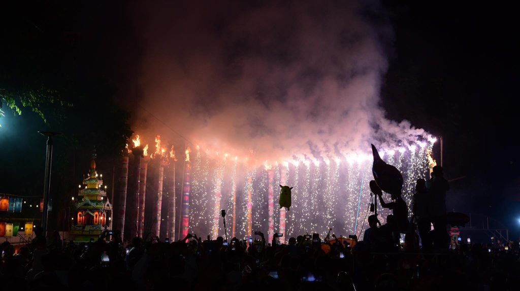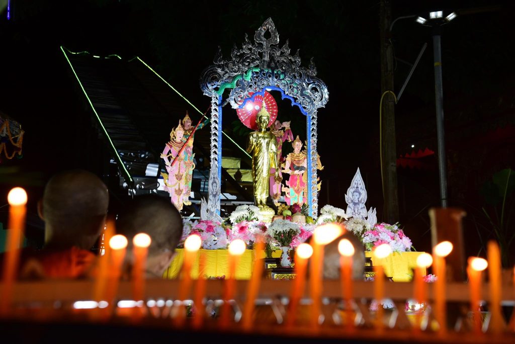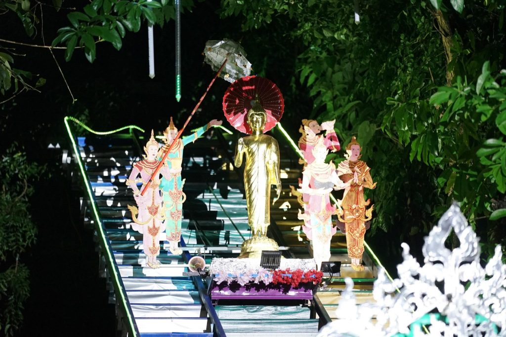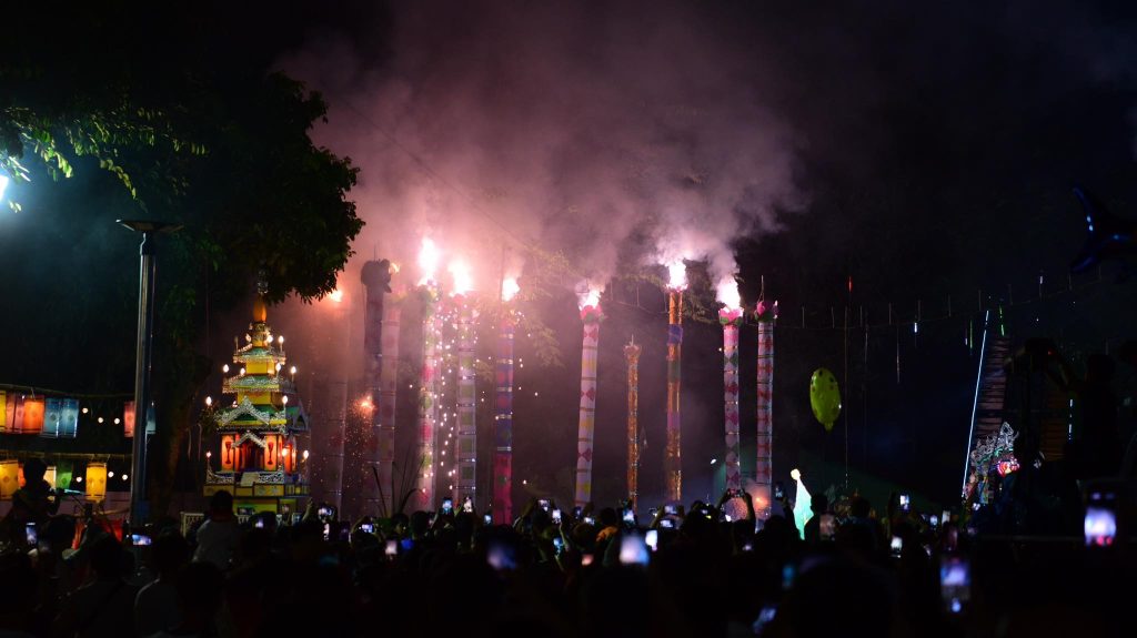 อีกหนึ่งพิธีกรรมสำคัญในงาน คือ การจุดต้นเกี๊ยะ (คบไฟสน) จุดไฟเพื่อบูชาพระพุทธเจ้า เป็นสัญลักษณ์แห่งการ บูชารัตนตรัย สะท้อนถึง ความศรัทธา ความสว่างไสว และการละสิ้นทุกข์โศก