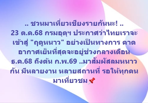 23 ตุลาคมนี้! ประเทศไทยเข้าสู่ฤดูหนาวปี 2568 อย่างเป็นทางการ กรมอุตุฯ ชี้ปีนี้หนาวช้ากว่าปกติเล็กน้อย คาดเย็นสุดกลางธันวาคมถึงต้นกุมภาพันธ์ พร้อมเตือนฝนหนักภาคใต้