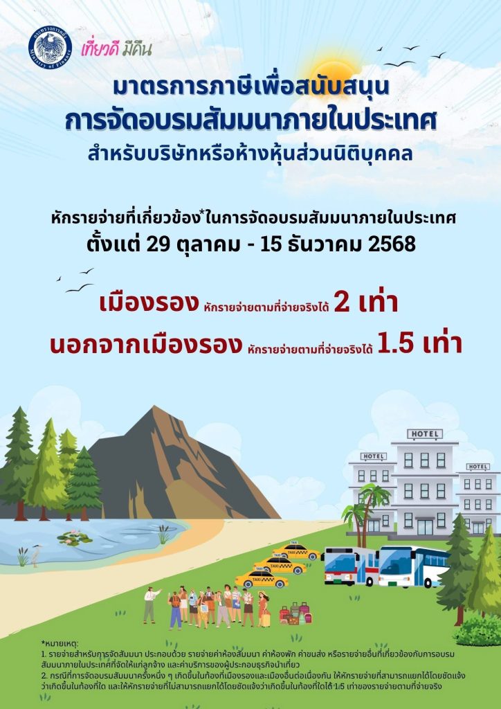 - ให้ผู้มีเงินได้ แต่ไม่รวมถึงห้างหุ้นส่วนสามัญหรือคณะบุคคลที่มิใช่นิติบุคคลนำค่าที่พัก และค่าบริการของร้านอาหารที่จ่ายให้แก่ผู้ประกอบการจดทะเบียนภาษีมูลค่าเพิ่ม ตั้งแต่วันที่ 29 ตุลาคม – 15 ธันวาคม 2568 ในการเดินทางท่องเที่ยวในประเทศมาหักลดหย่อนตามจำนวนที่จ่ายจริง แต่ไม่เกิน 20,000 บาท