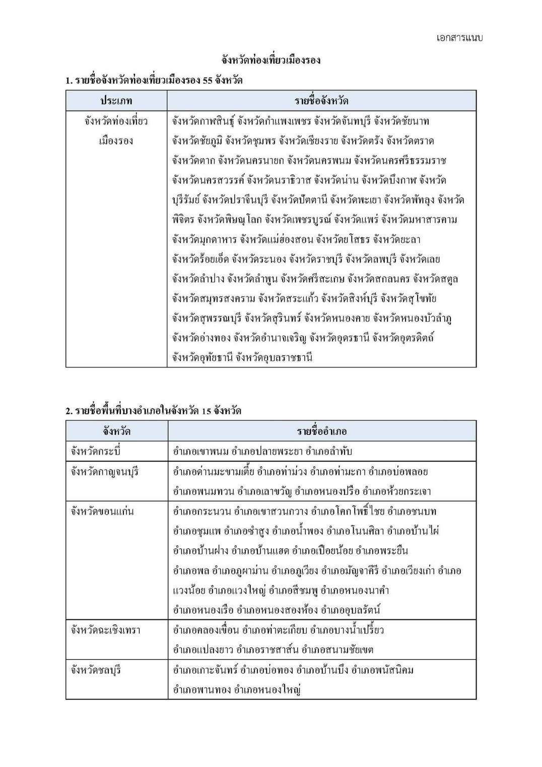 (1) ลดหย่อนได้ 1.5 เท่าของค่าที่พักและค่าบริการของร้านอาหารตามที่จ่ายจริงในจังหวัดท่องเที่ยวรอง จำนวน 55 จังหวัด และพื้นที่บางอำเภอในจังหวัด 15 จังหวัด ตามประกาศอธิบดีกรมสรรพากร