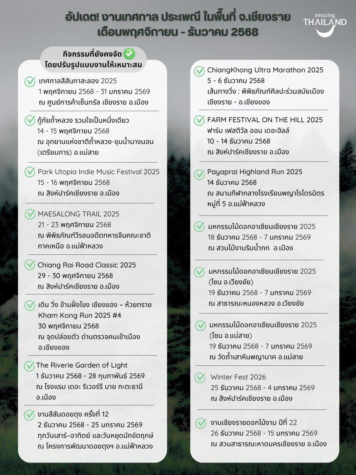 ททท.สำนักงานเชียงราย รวบรวมกิจกรรมท่องเที่ยวตลอดเดือนพฤศจิกายน – ธันวาคม 2568 มาไว้ให้แล้ว! อย่าลืมกด Save แล้วปักหมุดกันไว้ได้เลย