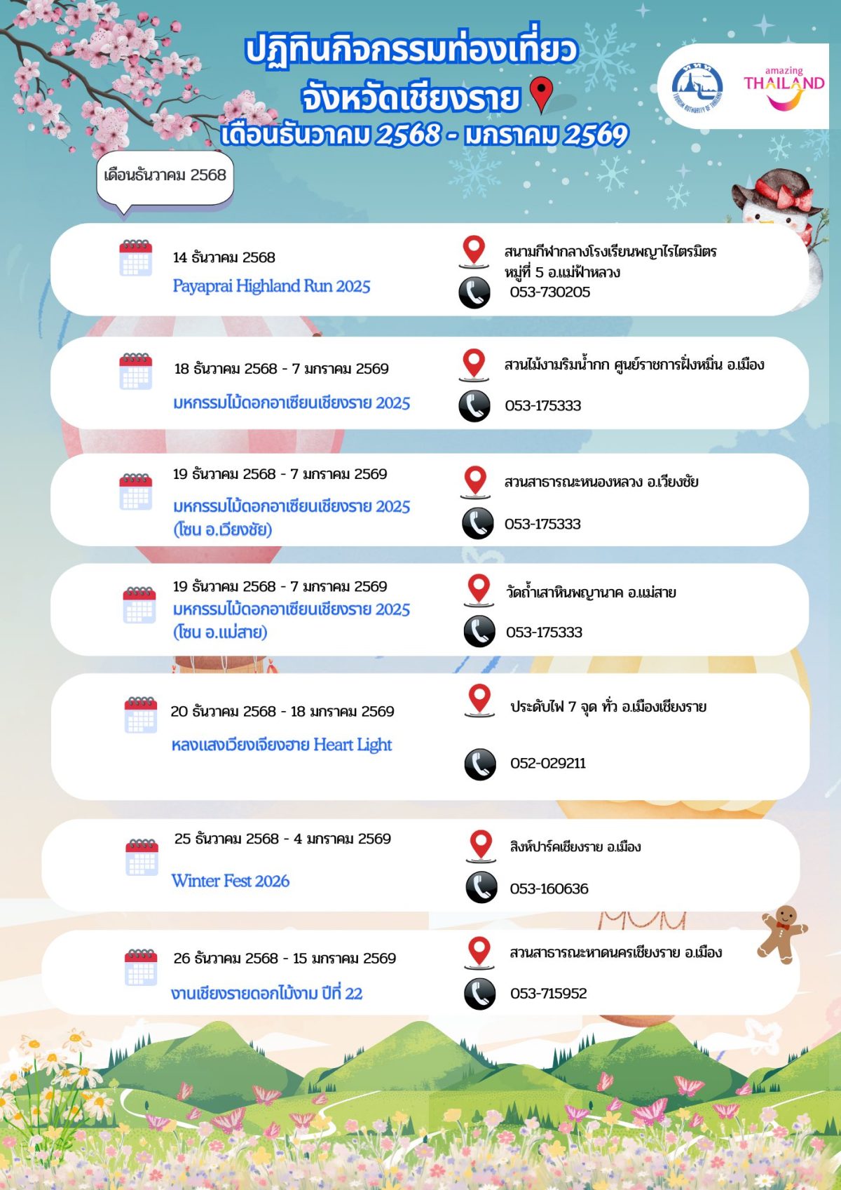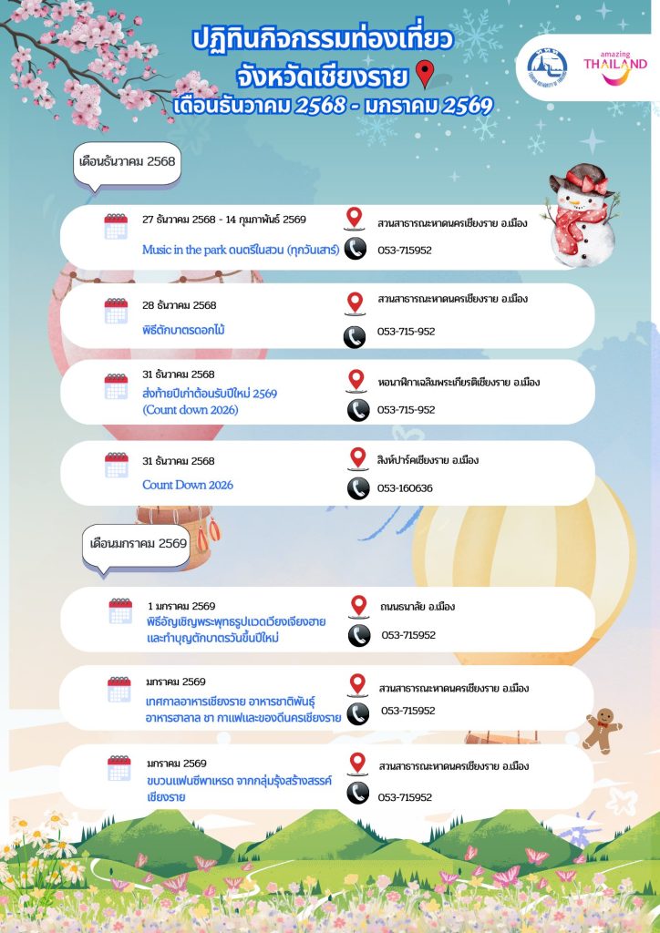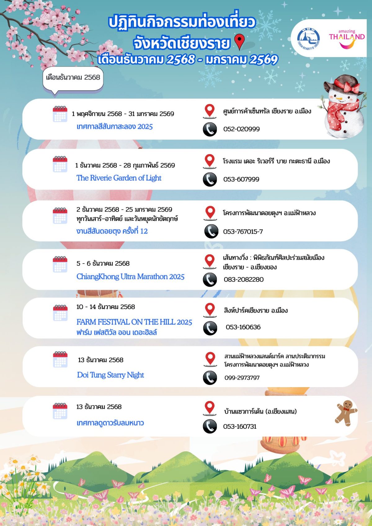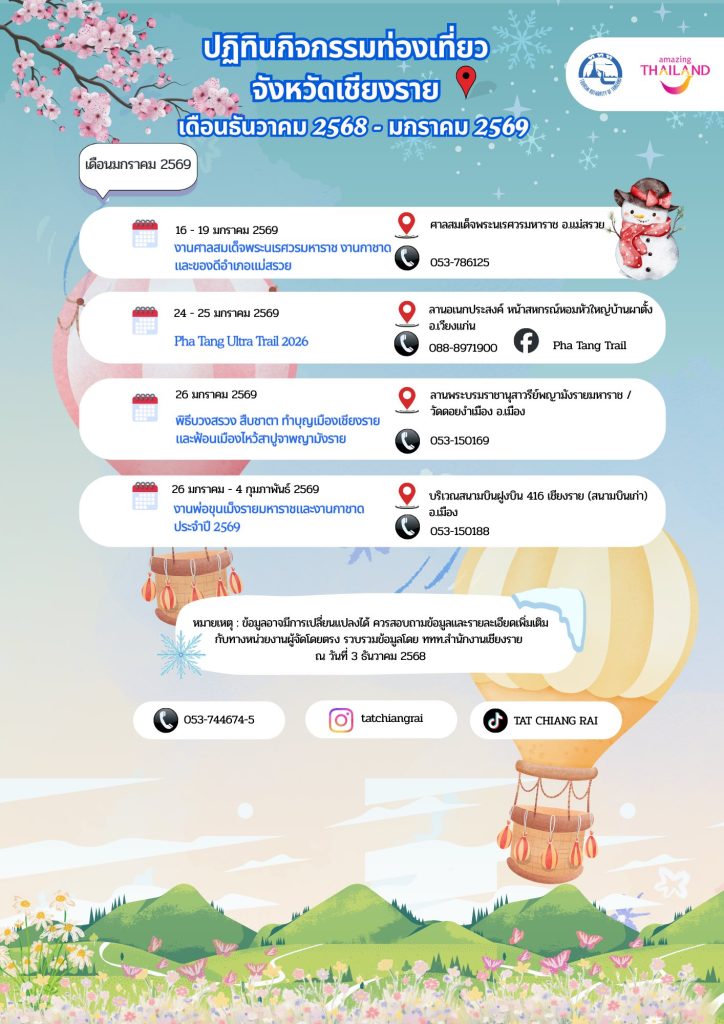 หมายเหตุ : ข้อมูลอาจมีการเปลี่ยนแปลงได้ ควรสอบถามข้อมูลและรายละเอียดเพิ่มเติมกับทางหน่วยงานผู้จัดโดยตรง รวบรวมข้อมูลโดย ททท.สำนักงานเชียงราย ณ วันที่ 3 ธันวาคม 2568