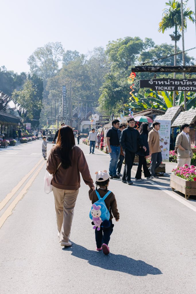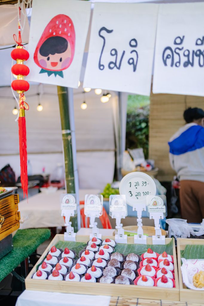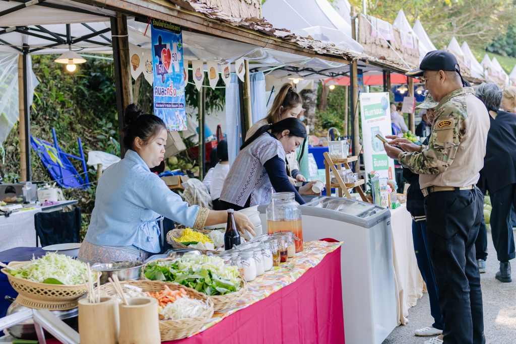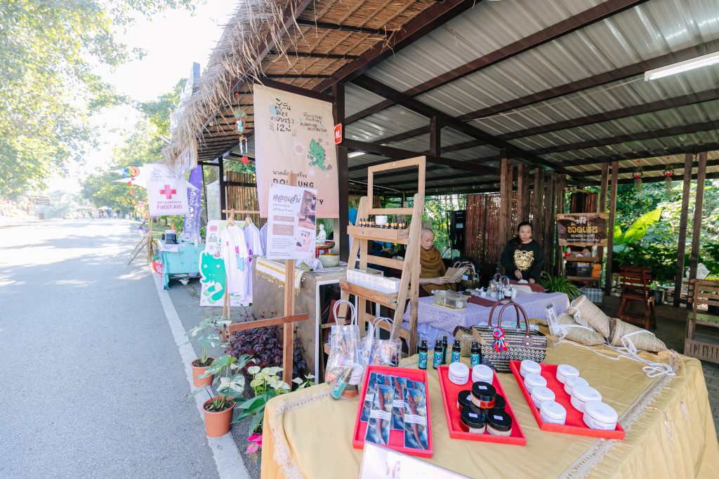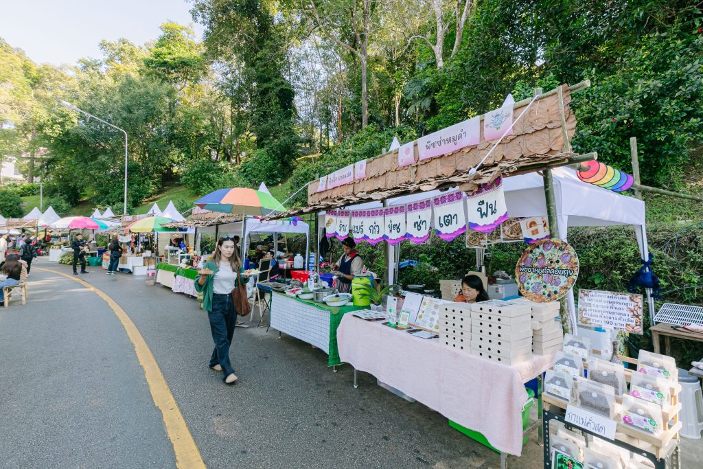 4.) ถนนคนเดินดอยตุง รวมงานหัตถกรรมเสื้อผ้า กระเป๋าทอมือ อาหารพื้นถิ่น และเมนูพิเศษ เช่น พิซซ่าหมูดำ ข้าวซอย น้ำเงี้ยว น้ำพริกหนุ่ม รวมถึงไอศกรีม Soft Serve จากวัตถุดิบที่ปลูกบนดอยตุง