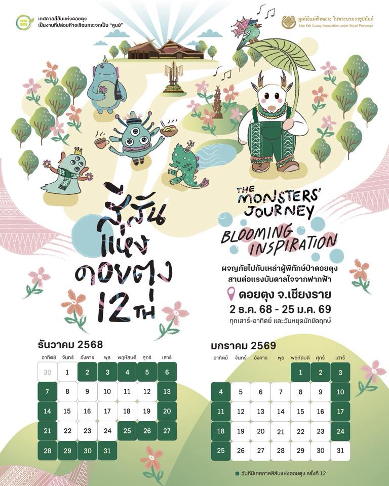 จัดพิธีเปิดงานเทศกาล “สีสันแห่งดอยตุง ครั้งที่ 12” อย่างเป็นทางการ ณ สวนแม่ฟ้าหลวง โครงการพัฒนาดอยตุงอันเนื่องมาจากพระราชดำริ อำเภอแม่ฟ้าหลวง จังหวัดเชียงราย ภายใต้แนวคิด The Monsters’ Journey “Blooming Inspiration” ผจญภัยไปกับเหล่าผู้พิทักษ์ป่าดอยตุง สานต่อแรงบันดาลใจจากฟากฟ้า จัดขึ้นระหว่างวันที่ 2 ธันวาคม 2568 – 25 มกราคม 2569 ทุกวันเสาร์ – อาทิตย์ และวันหยุดนักขัตฤกษ์ เวลา 08.00 – 18.00 น.