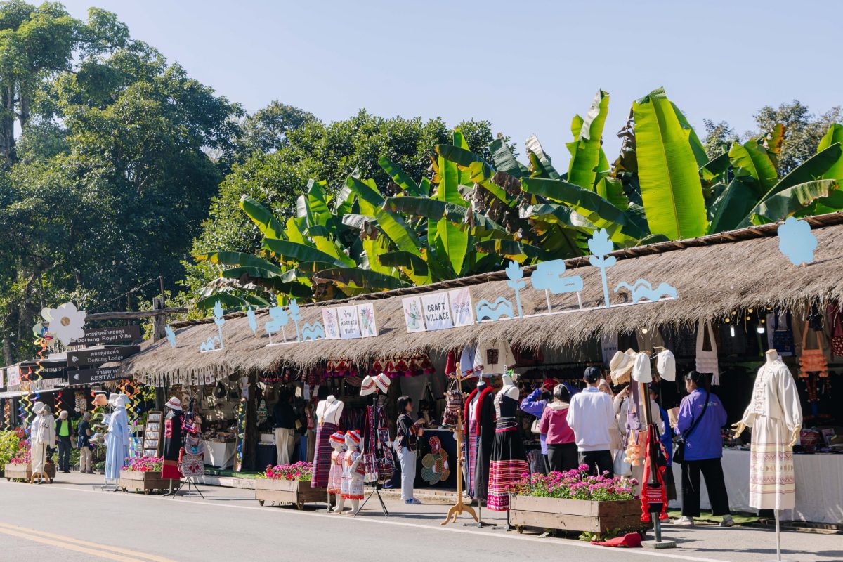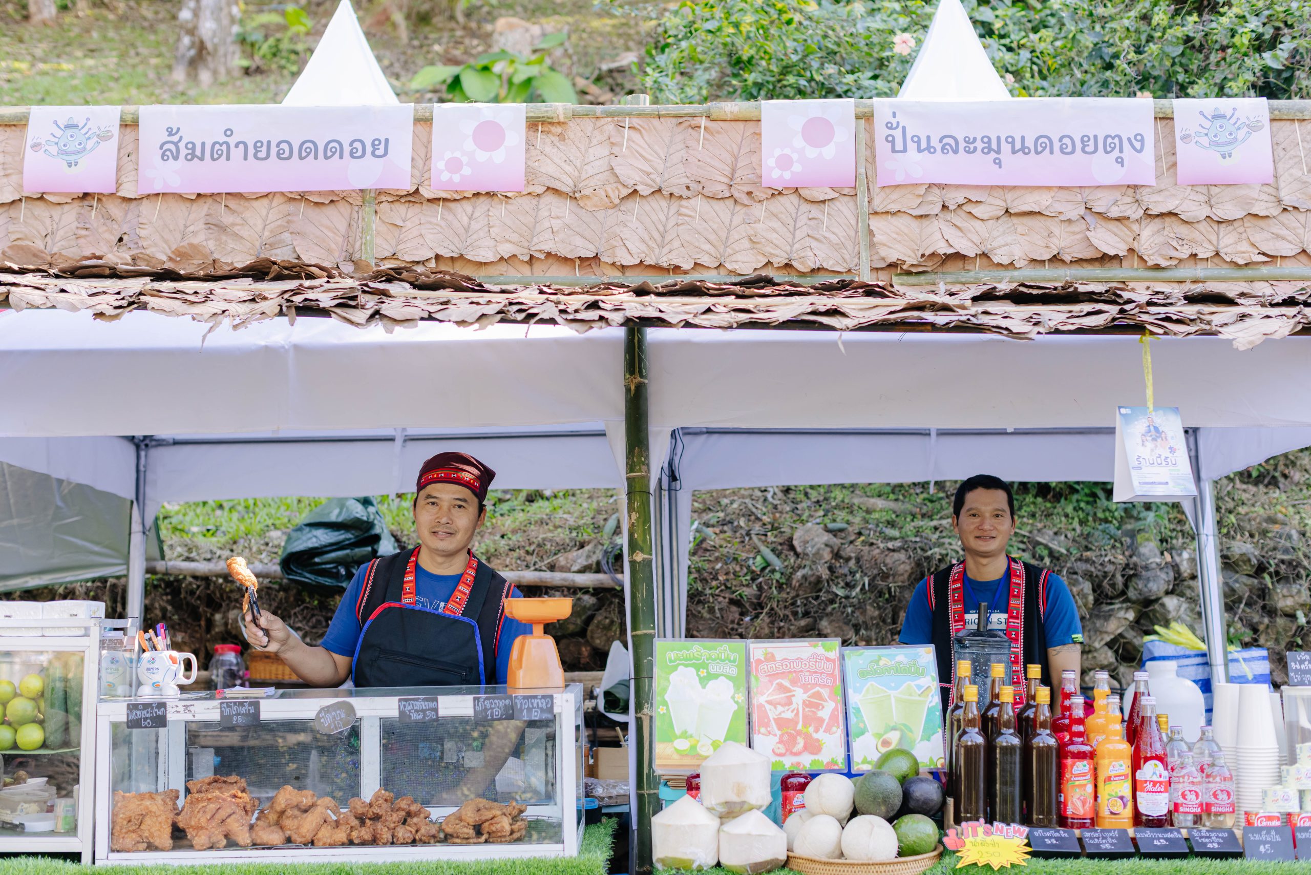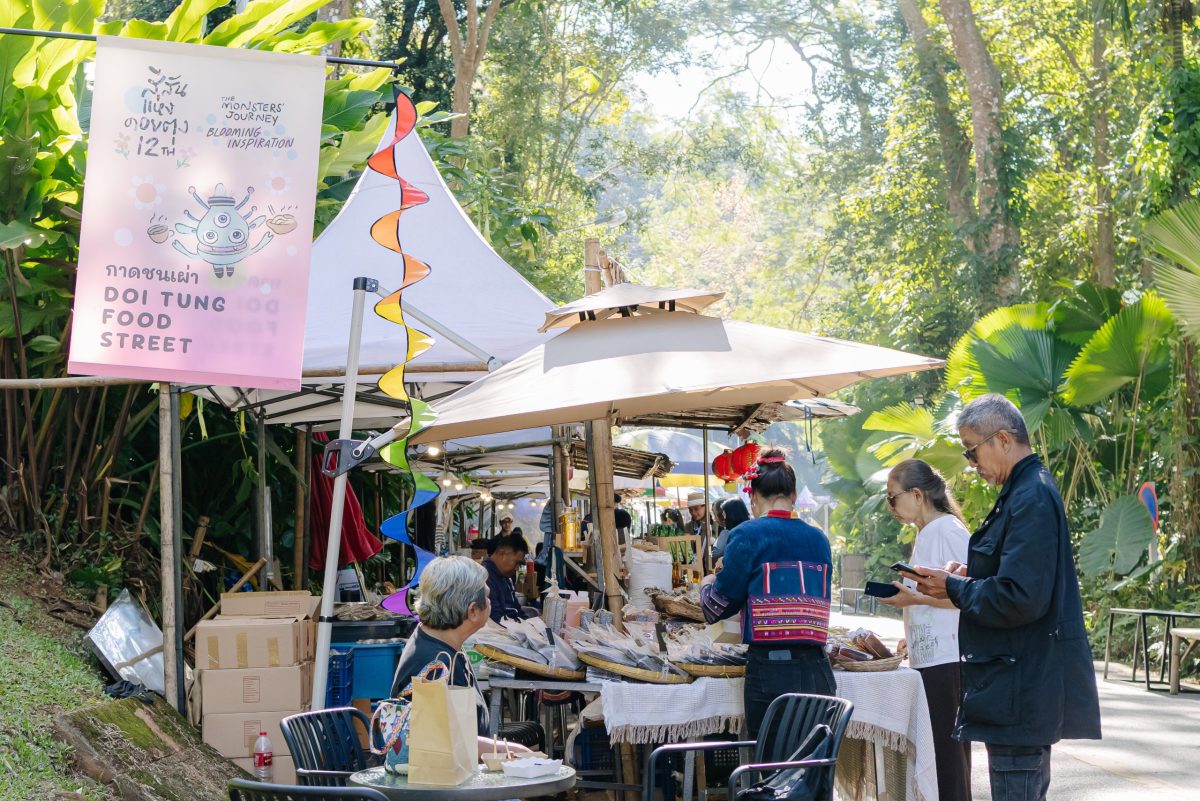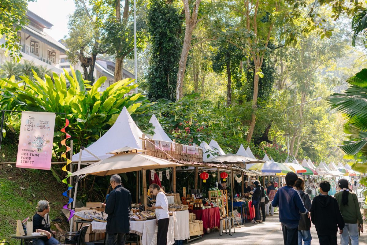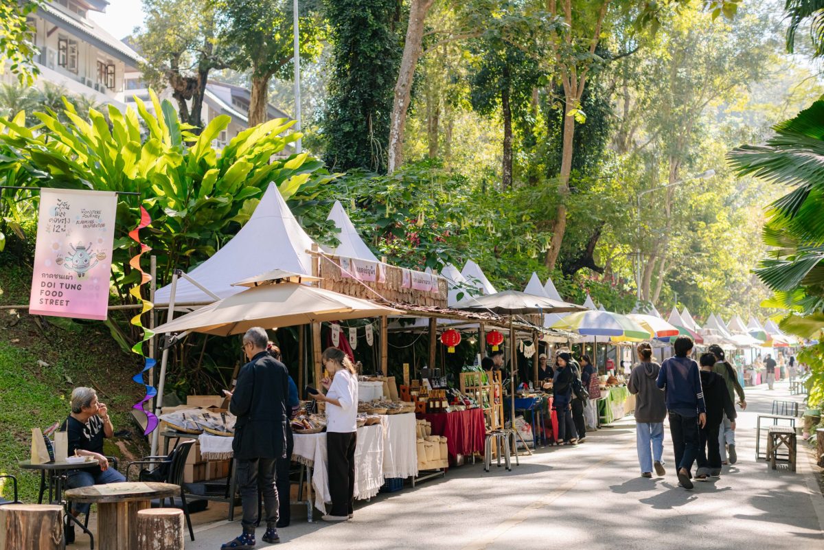 4.) ถนนคนเดินดอยตุง รวมงานหัตถกรรมเสื้อผ้า กระเป๋าทอมือ อาหารพื้นถิ่น และเมนูพิเศษ เช่น พิซซ่าหมูดำ ข้าวซอย น้ำเงี้ยว น้ำพริกหนุ่ม รวมถึงไอศกรีม Soft Serve จากวัตถุดิบที่ปลูกบนดอยตุง