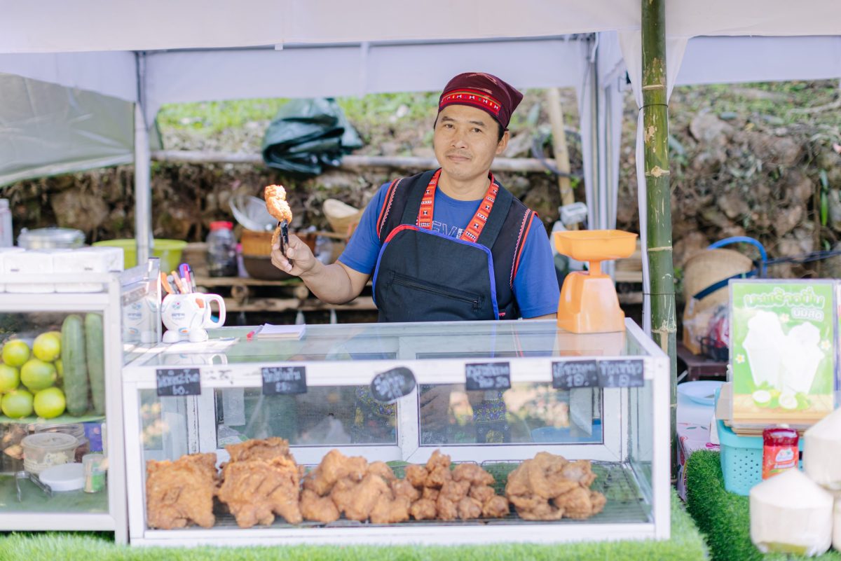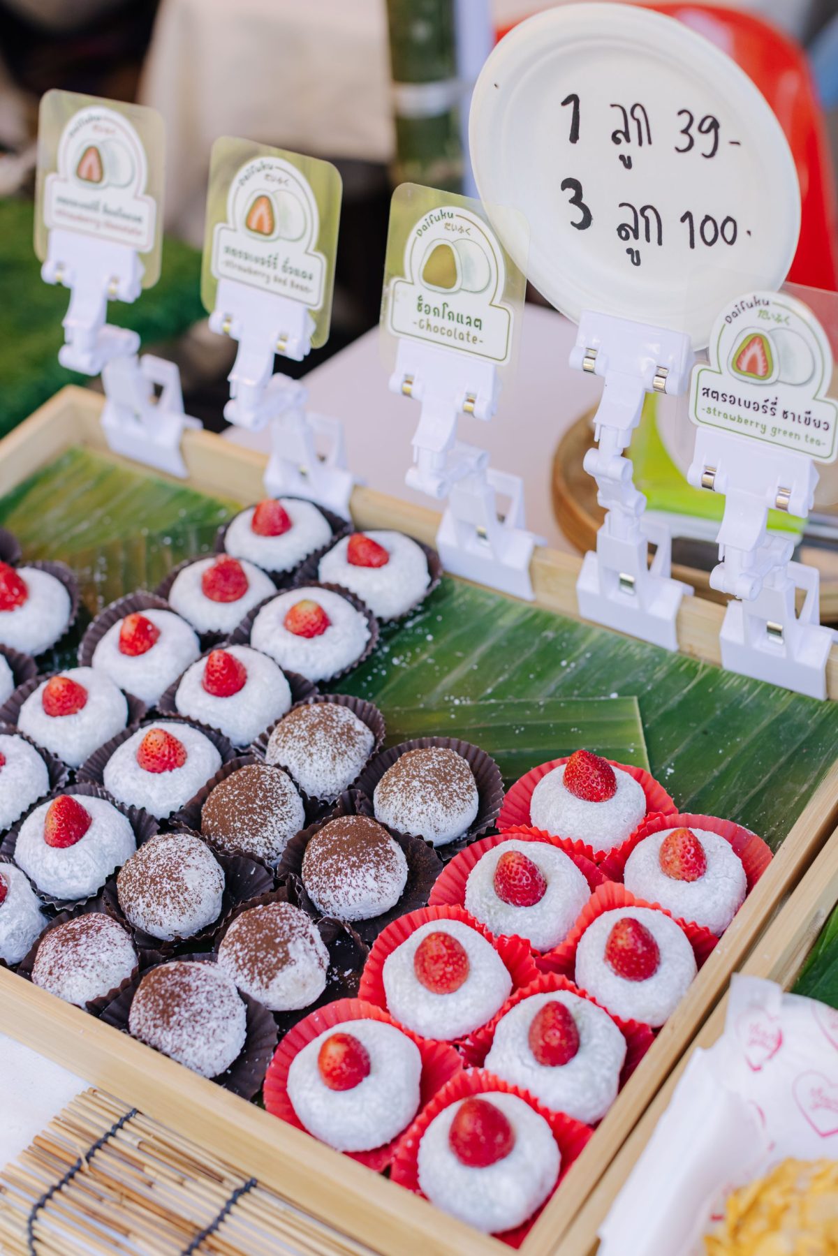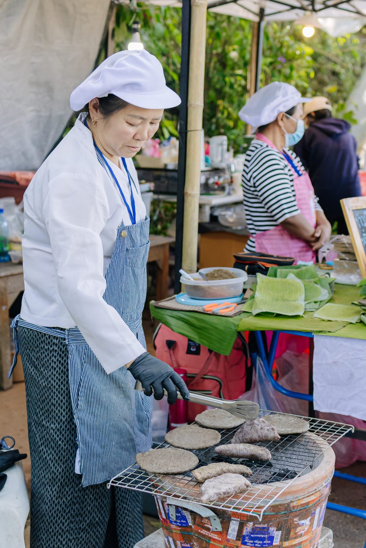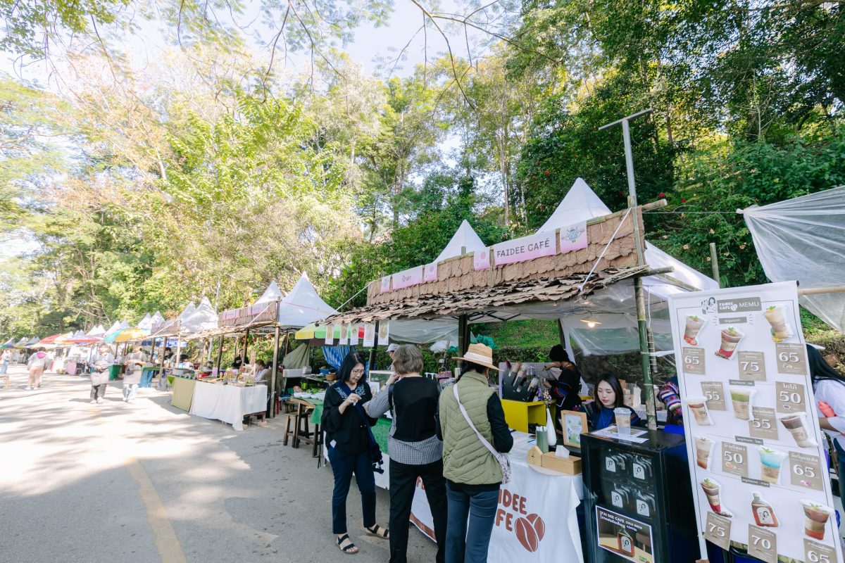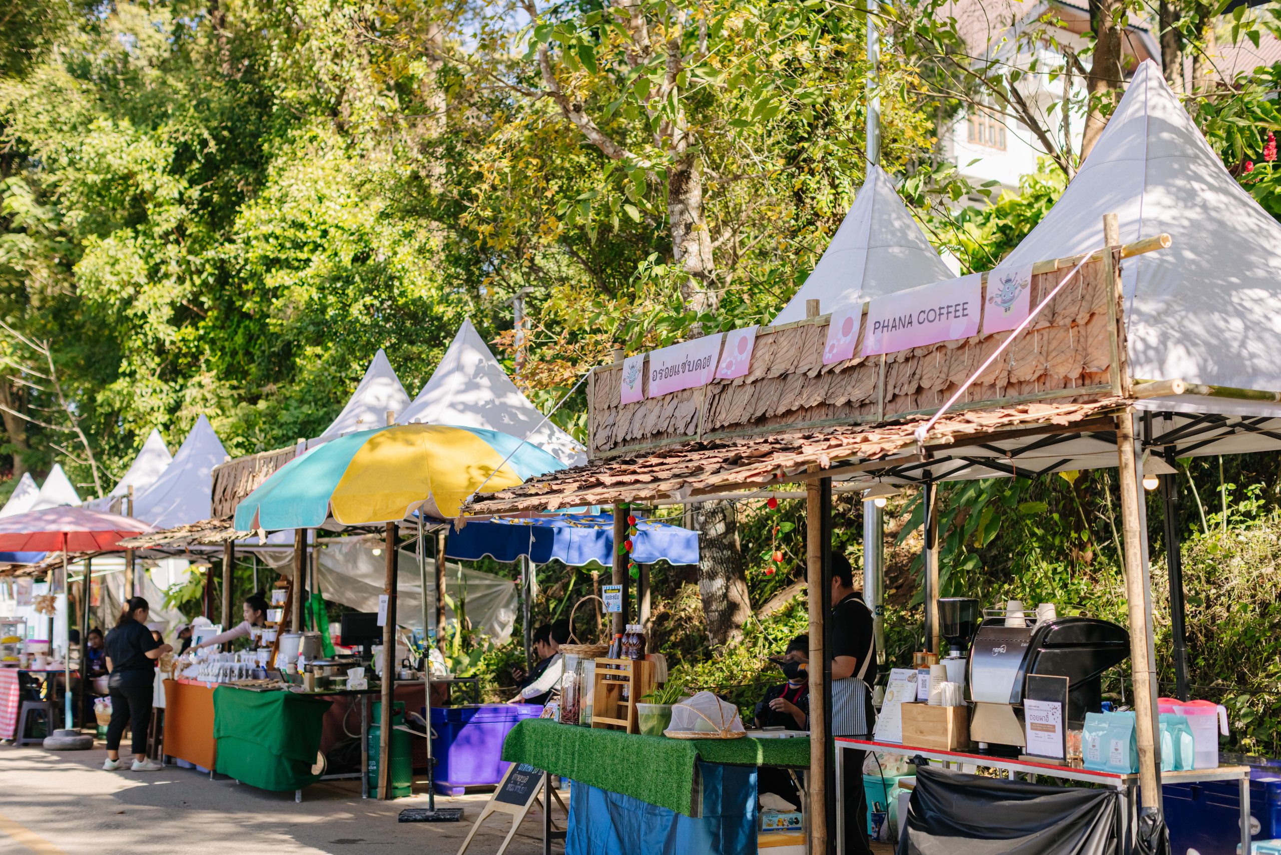 4.) ถนนคนเดินดอยตุง รวมงานหัตถกรรมเสื้อผ้า กระเป๋าทอมือ อาหารพื้นถิ่น และเมนูพิเศษ เช่น พิซซ่าหมูดำ ข้าวซอย น้ำเงี้ยว น้ำพริกหนุ่ม รวมถึงไอศกรีม Soft Serve จากวัตถุดิบที่ปลูกบนดอยตุง