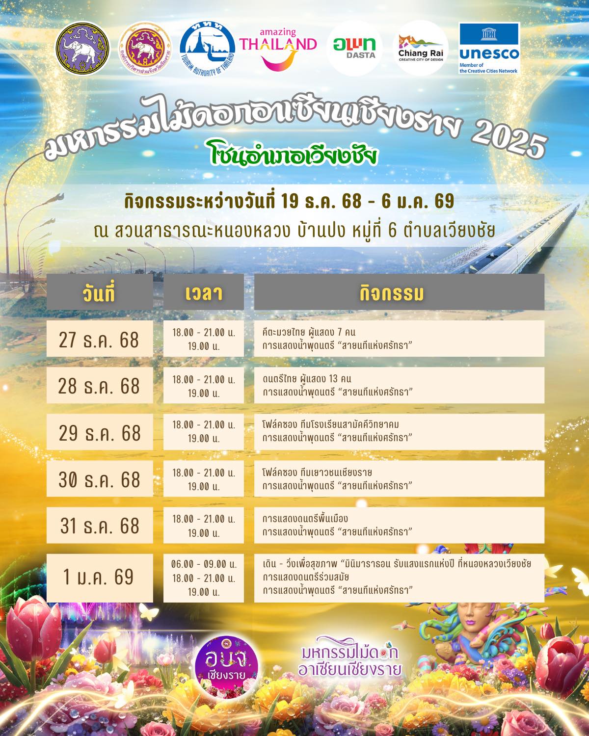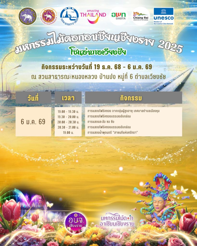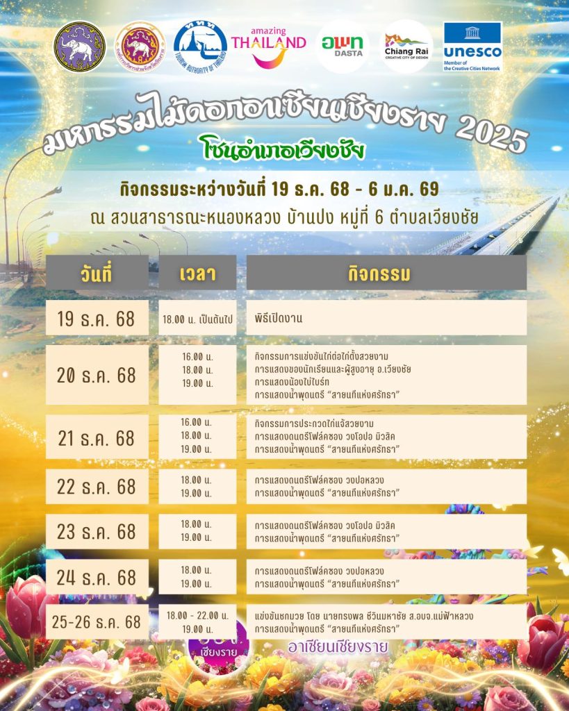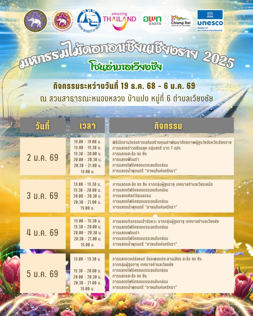 ตารางกิจกรรมของงาน “มหกรรมไม้ดอกอาเซียนเชียงราย 2025” โซนอำเภอเวียงชัย