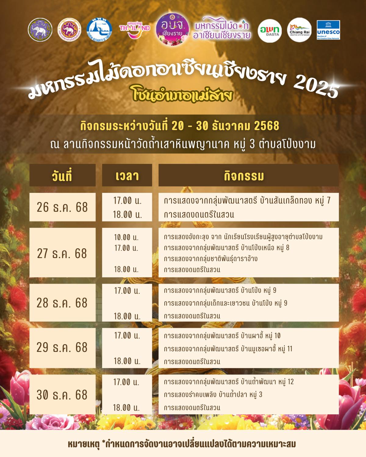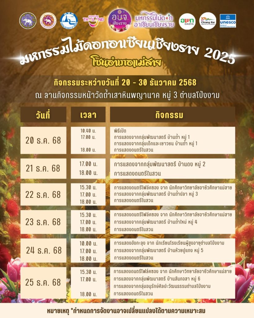 ตารางกิจกรรมของงาน “มหกรรมไม้ดอกอาเซียนเชียงราย 2025” โซนอำเภอแม่สาย
