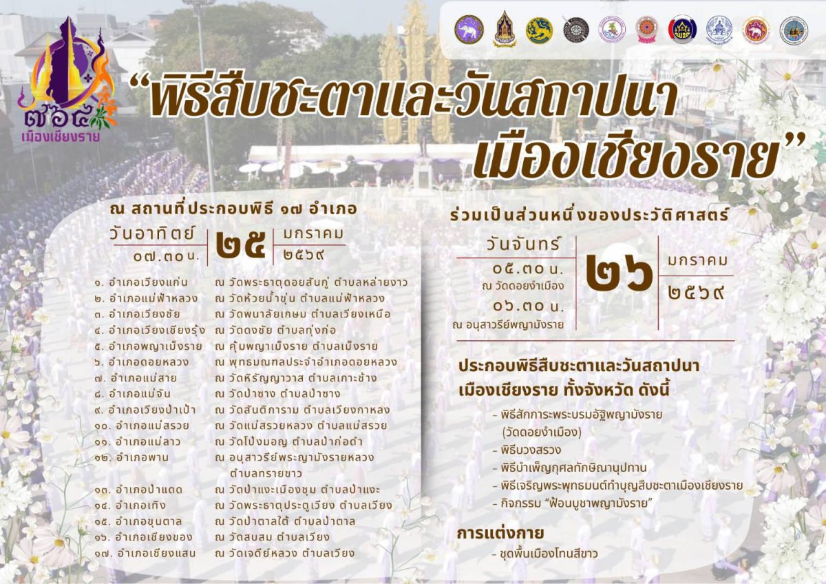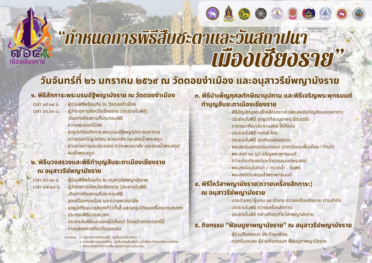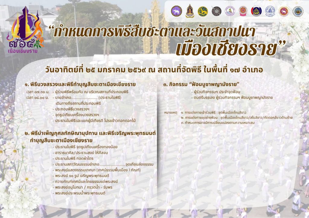 สำนักงานวัฒนธรรมจังหวัดเชียงราย ขอเชิญชวนทุกท่านร่วม “พิธีสืบชะตาและวันสถาปนาเมืองเชียงราย” ประจำปี 2569