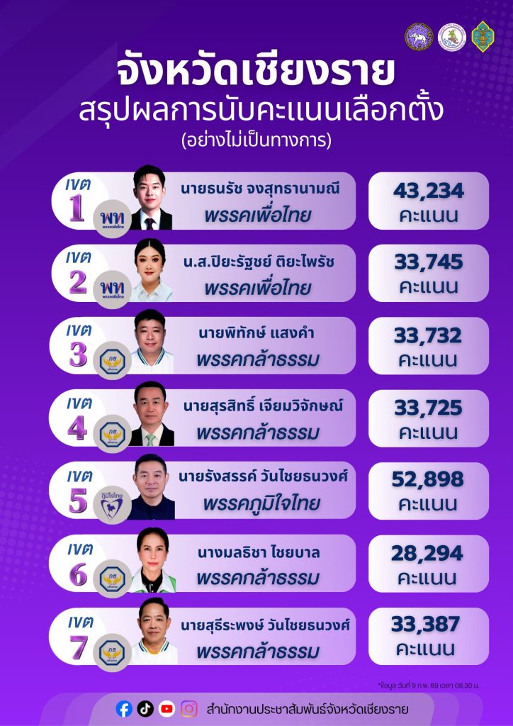 ผลคะแนนอย่างไม่เป็นทางการ ณ วันที่ 9 กุมภาพันธ์ 2569 เวลา 08.30