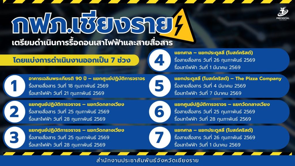 ทั้งนี้ การไฟฟ้าส่วนภูมิภาคจังหวัดเชียงราย จะประสานงานด้านการจราจรในวันที่ดำเนินการรื้อถอนเสาไฟฟ้า และขอความร่วมมือผู้ประกอบการสายสื่อสาร งดการรื้อถอนสายสื่อสารนอกเวลาที่กำหนด เพื่อให้การดำเนินงานเป็นไปอย่างปลอดภัยและไม่กระทบต่อประชาชนโดยรวม