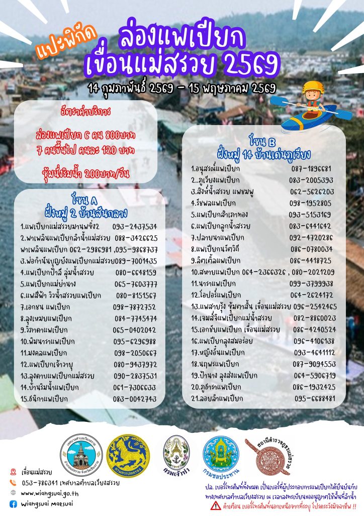 ปล. เบอร์โทรศัพท์ทั้งหมด เป็นเบอร์ที่่ผู้ประกอบการแพเปียกได้ยืนยันกับทางเทศบาลตำบลเวียงสรวย ณ เวลาลงทะเบียนขออนุญาตใช้พื้นที่ลำน้ำ