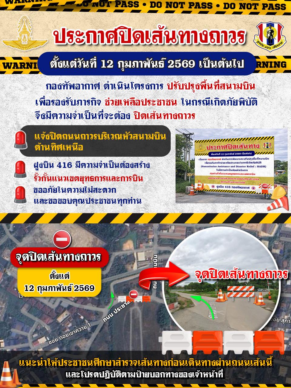 ประกาศประชาสัมพันธ์ การปิดเส้นทางถาวร บริเวณถนนตัดผ่านหัวสนามบินด้านทิศเหนือ ฝูงบิน 416 เชียงราย