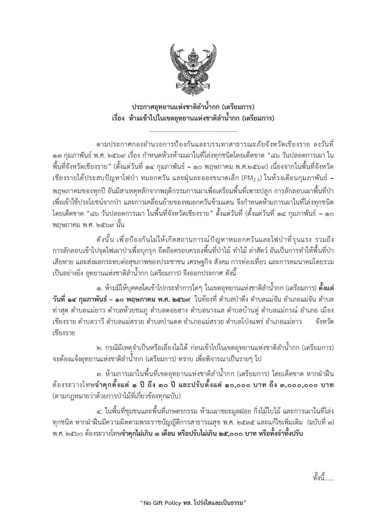 อุทยานแห่งชาติลำน้ำกก (เตรียมการ) ประกาศ ห้ามเข้าไปในเขตอุทยานแห่งชาติลำน้ำน้ำกก (เตรียมการ) ในห้วงห้ามเผาในที่โล่งทุกชนิดโดยเด็ดขาด (ตั้งแต่วันที่ 14 กุมภาพันธ์ – 10 พฤษภาคม พ.ศ.2569)