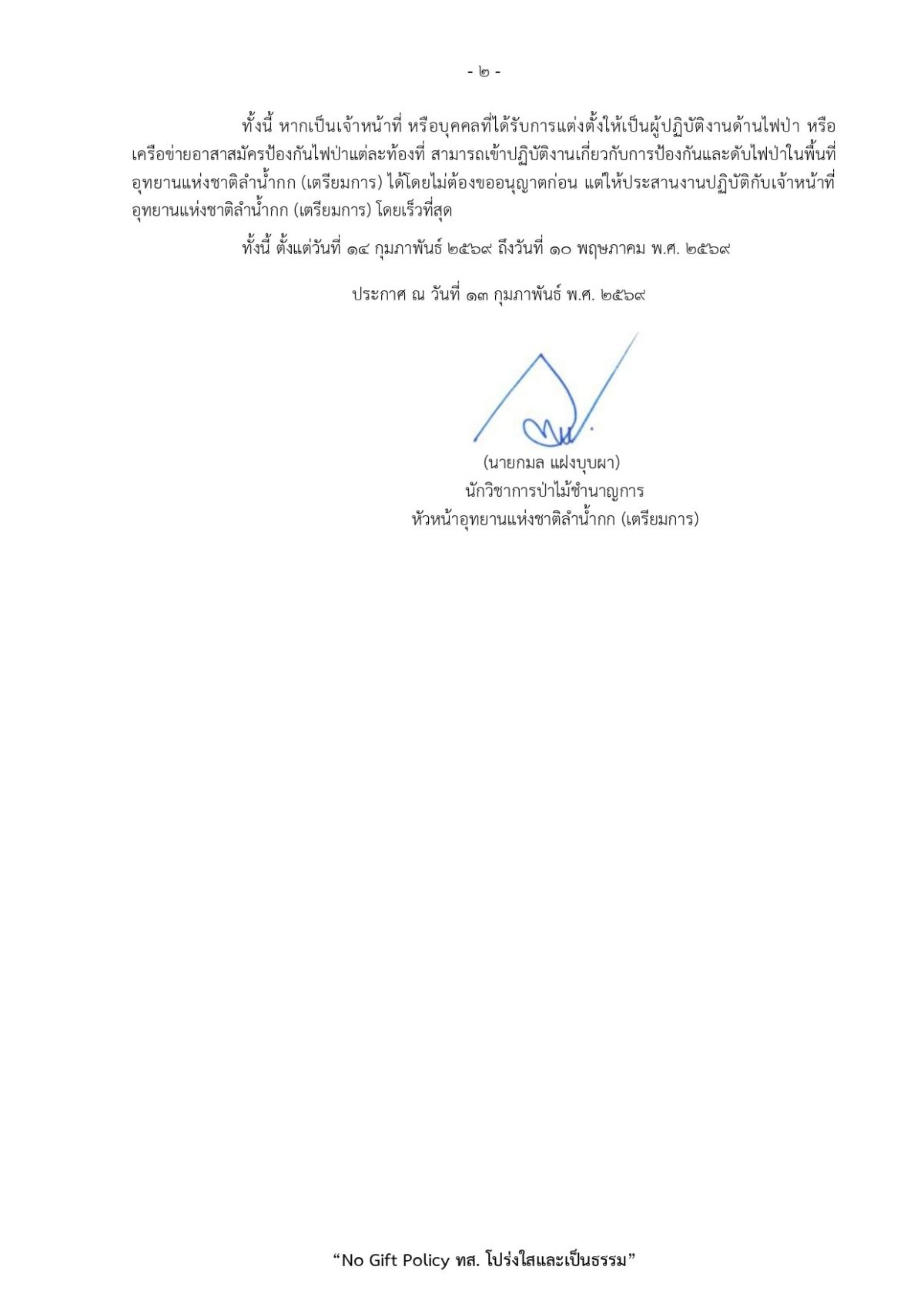 ทั้งนี้ หากเป็นเจ้าหน้าที่ หรือบุคคลที่ได้รับการแต่งตั้งให้เป็นผู้ปฏิบัติงานด้านไฟป่า หรือเครือข่ายอาสาสมัครป้องกันไฟป่าแต่ละท้องที่ สามารถเข้าปฏิบัติงานเกี่ยวกับการป้องกันและดับไฟป่าในพื้นที่อุทยานแห่งชาติลำน้ำน้ำกก (เตรียมการ) ได้โดยไม่ต้องของขออนุญาตก่อน แต่ให้ประสานงานปฏิบัติกับเจ้าหน้าที่อุทยานแห่งชาติลำน้ำกก (เตรียมการ) โดยเร็วที่สุด ทั้งนี้ ตั้งแต่วันที่ 14 กุมภาพันธ์ 2569 ถึงวันที่ 10 พฤษภาคม พ.ศ. 2569