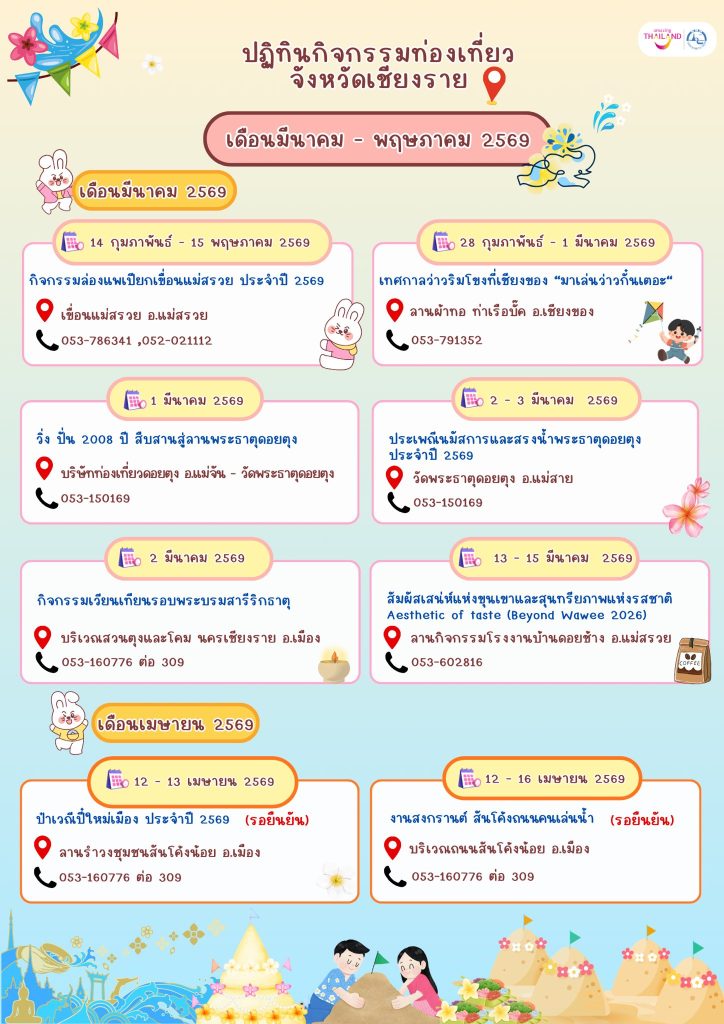 ปักหมุด ล็อควันด่วน! ปฏิทินกิจกรรมท่องเที่ยวเชียงราย เดือนมีนาคม – พฤษภาคม 2569 พร้อมเสิร์ฟเเล้วจ้า ไม่ว่าคุณจะเป็นสายบุญ สายชิล สายถ่ายรูป สายลุยๆ ก็เลือกวางแพลนได้ตามสไตล์ที่ใช่ เลือกกิจกรรมที่ชอบกันได้เลย!