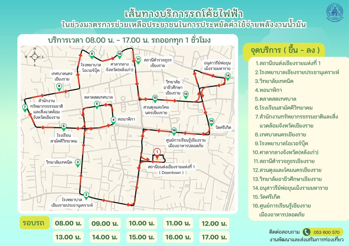 เทศบาลนครเชียงราย โดยนายวันชัย จงสุทธานามณี นายกเทศมนตรีนครเชียงราย ห่วงใยประชาชนในช่วงสถานการณ์วิกฤตการณ์น้ำมันปรับราคาสูงขึ้น จึงได้จัดบริการ รถโค้ช รับ-ส่งประชาชน เพื่ออำนวยความสะดวกด้านการเดินทาง และช่วยบรรเทาภาระค่าครองชีพของประชาชน