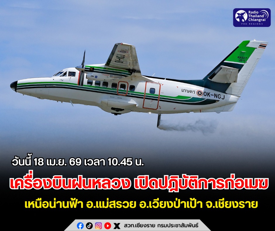 วันนี้ (18 เมษายน 2569) เวลา 10.45 น. มีการปฏิบัติการฝนหลวงเพื่อบรรเทาปัญหาฝุ่นละอองในพื้นที่ภาคเหนือ โดยเครื่องบินฝนหลวงแบบ L410NG จำนวน 1 ลำ ได้ขึ้นบินปฏิบัติภารกิจก่อเมฆ ที่ระดับความสูงประมาณ 8,500 ฟุต