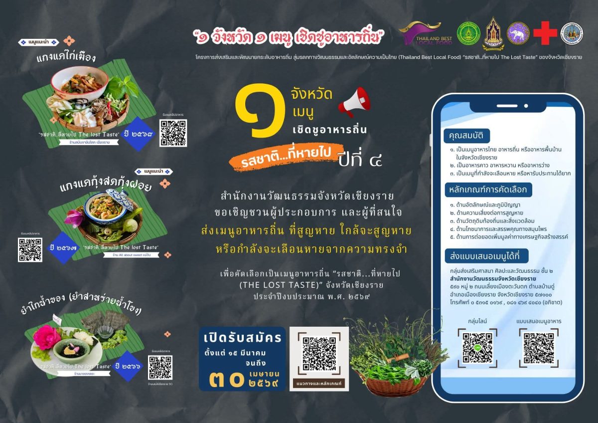 สำนักงานวัฒนธรรมจังหวัดเชียงราย ขอเชิญผู้ประกอบการร้านอาหาร ชุมชน และประชาชนทั่วไป ส่งแบบเสนอเมนูอาหารถิ่นที่สูญหาย ใกล้จะสูญหาย หรือกำลังจะเลือนหาย จากความทรงจำ