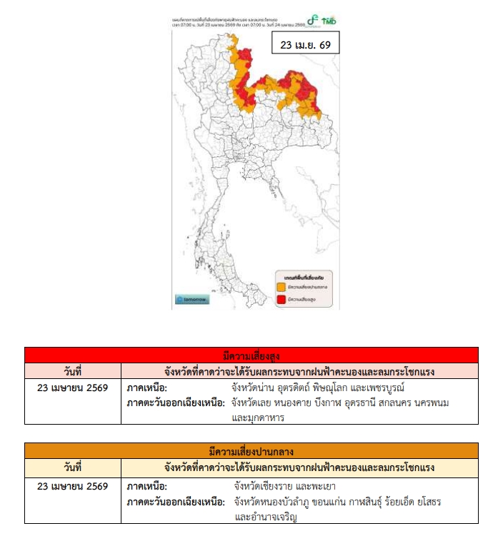 ในช่วงวันที่ 23-25 เม.ย. 69 ประเทศไทยตอนบนจะมีพายุฤดูร้อนเกิดขึ้น โดยมีลักษณะของพายุฝนฟ้าคะนอง