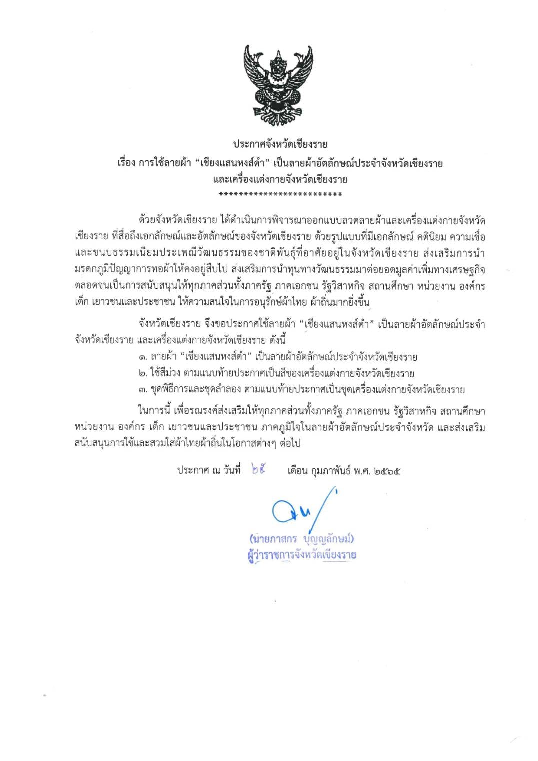 ๔.ในกรณีมีงานพิธีการสำคัญ จังหวัดเชียงราย อาจกำหนดให้มีการแต่งกายชุดเชียงรายพิธีการตามประกาศจังหวัดเชียงราย เรื่อง การใช้ลายผ้า “เชียงแสนหงส์ดำ” เป็นลายผ้าอัตลักษณ์ประจำจังหวัดเชียงราย และเครื่องแต่งกายจังหวัดเชียงราย ลงวันที่ ๒๕ กุมภาพันธ์ พ.ศ. ๒๕๖๕