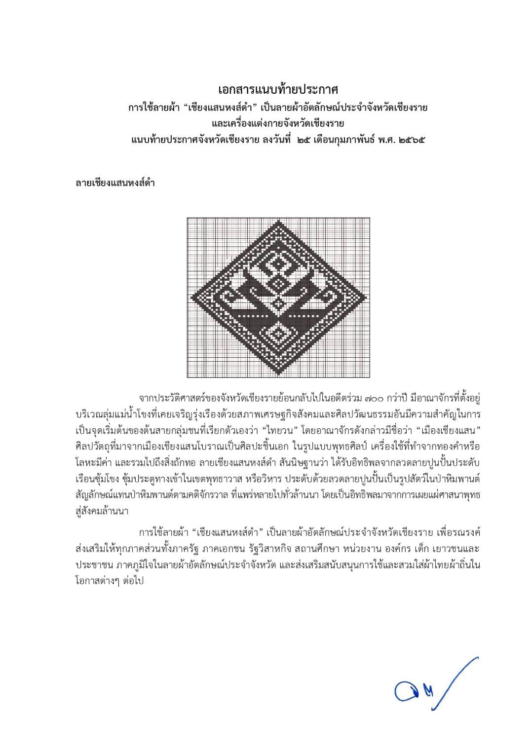สแกนคิวอาร์โค๊ดเพื่อดูรายละเอียด เอกสารแนบท้ายประกาศ การใช้ลายผ้า “เชียงแสนหงส์ดำ”