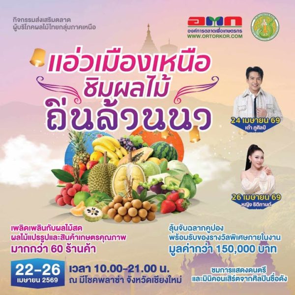 17 เม.ย. 2026 291 อ.ต.ก. เชิญร่วมงาน “แอ่วเมืองเหนือ ชิมผลไม้ ถิ่นล้านนา”