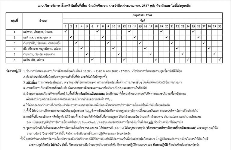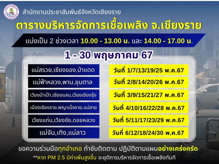 03 พ.ค. 2024 2068 มาตรการบริหารจัดการเชื้อเพลิงในพื้นที่เสี่ยง จังหวัดเชียงราย ปี 67 ระหว่างวันที่ 1-30 พฤษภาคม 2567 หากผู้ใดไม่ปฏิบัติตามแผนที่กำหนดของจังหวัด แจ้งเบาะแส และมีรางวัลนำจับ 5,000 บาท