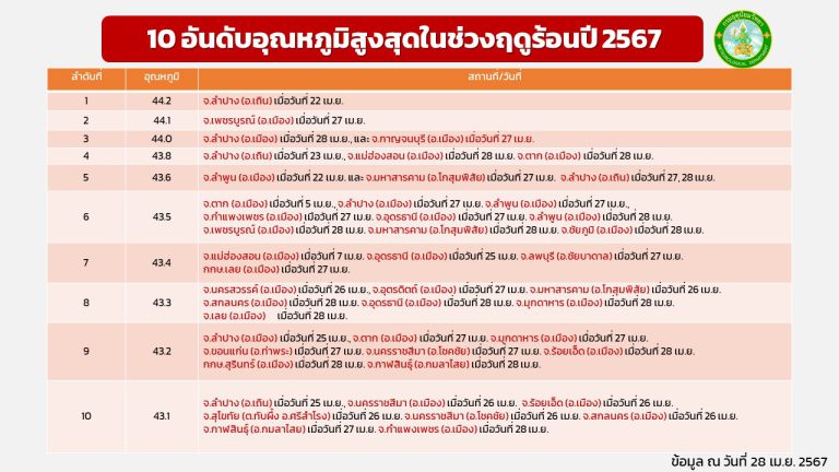 29 เม.ย. 2024 997 10 อันดับอุณหภูมิสูงสุดประจำฤดูร้อน 2567