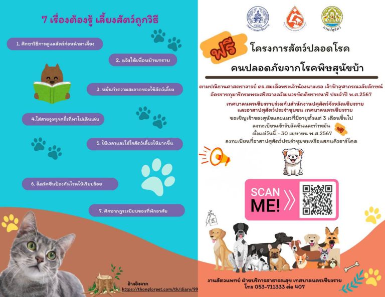 27 เม.ย. 2024 1952 เชิญชวนเจ้าของ “สุนัขและแมว” ที่มีอายุ 3 เดือนขึ้นไป ลงทะเบียนเข้ารับวัคซีนและทำหมันฟรี!! ตั้งแต่วันนี้ – 30 เม.ย.67