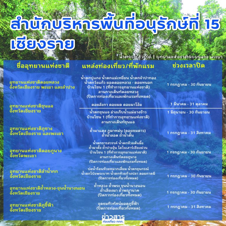 09 พ.ค. 2024 1113 ปิดการท่องเที่ยวและพักแรมในอุทยานแห่งชาติ และวนอุทยาน ประจำปี 2567 (เชียงราย – พะเยา)