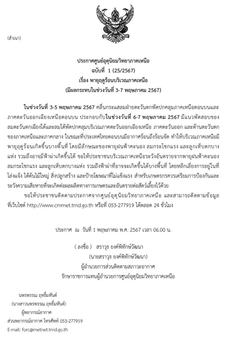 01 พ.ค. 2024 768 กรมอุตุฯ ออกประกาศเตือนพายุฤดูร้อนบริเวณภาคเหนือ ช่วง 3-7 พ.ค.2567